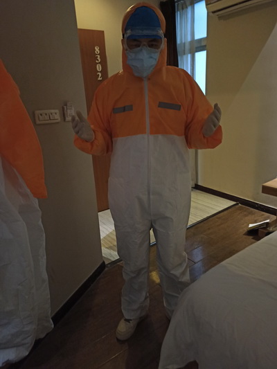仅一天时间,锦怡酒店隔离点的被隔离者已经达到105人,分别住在酒店的2-6楼,每天上午8:30和下午1:30开始为他们测量体温,询问健康状况、是否按时吃药等,整个工作完成需要2个小时左右。每天脱下隔离服,浑身是汗,连隔离服里面的羽绒服都湿透。