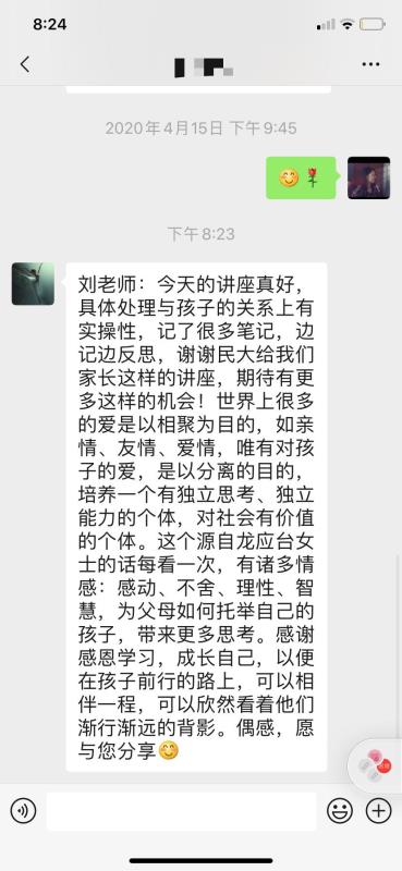 本次“同心抗疫情、稳固心防线”系列网络心理讲座,是我校心理中心面对学校在当前疫情防控特殊时段和特殊背景下面临更严峻的形势和更艰巨的任务,强化学生心理健康教育工作的新尝试新探索。网络讲座因形式新颖的双讲师授课方式,生动活泼的讲座内容,便捷灵活的收看方式,深受学校师生和学生家长的好评,大家纷纷在后台留言,发表参加讲座的感受、体会和评价。一位家长在后台留言“今天的讲座真好,具体处理与孩子的关系上有实操性,记了很多笔记,边记边反思,谢谢民大给我们家长这样的讲座,期待有更多这样的机会!世界上很多的爱是以相聚为目的,如亲情、友情、爱情;唯有对孩子的爱,是以分离为目的的,培养一个有独立思考、独立能力的个体,对社会有价值的个体”,表达了对学校的感谢,对亲子关系的思考。