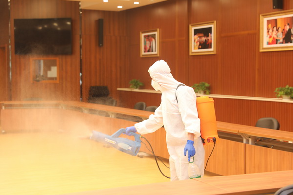 新闻网讯 为确保返校毕业生在学校活动的重点公共区域环境卫生安全,根据《william威廉中文官网2020年春季学期学生返校工作方案》文件精神和要求,结合学校疫情防控实际情况,6月6日,我校后勤保障处组织专业消杀公司对学校重点公共区域进行全面消毒杀菌。
