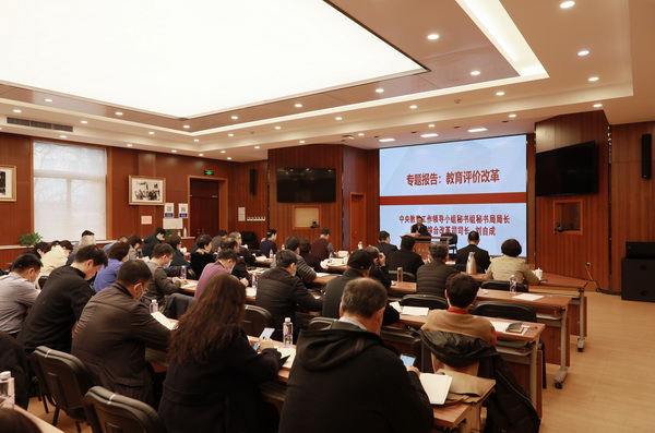 新闻网讯 2月26日上午,中央教育工作领导小组秘书组秘书局局长、教育部综合改革司司长刘自成,教育部综合改革司体制改革处处长李轶群,教育部综合改革司体制改革处干部张江龙来我校调研指导工作。受学校邀请,刘自成以“教育评价改革”为主题为我校第六期新学期干部培训班作首场专题报告,深入解读《深化新时代教育评价改革总体方案》(以下简称《总体方案》)理念、思路和贯彻落实。全体在校领导,校长助理,各部门、各单位主要负责人在知行堂主会场,其余教职员工在线上终端,共计1300余人参加培训。校党委常委、副校长宋敏主持报告会。