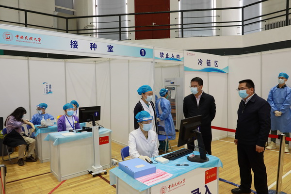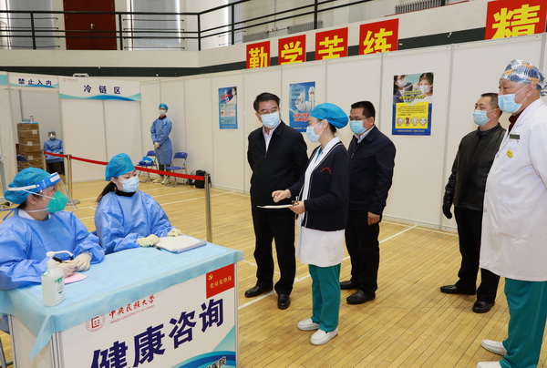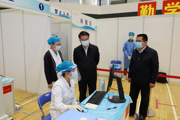 接种首日,党委书记张京泽来到疫苗接种现场检查指导工作,看望前来进行核酸检测、疫苗接种的同学们,以及现场的医务工作者和组织保障人员,确保相关工作安全有序开展。