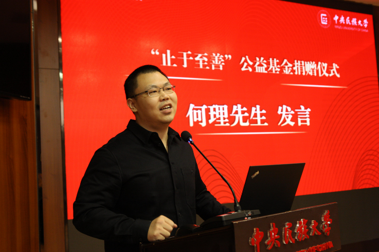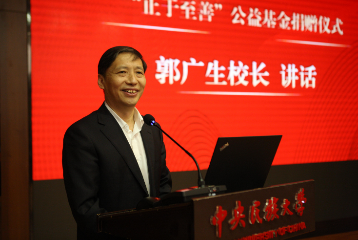 捐赠仪式上,郭广生指出,今年是学校发展历程中的关键之年,何理校友的捐赠具有重要意义。一是学校即将喜迎校庆70周年。建校以来,民大始终传承红色基因,为民族团结进步事业做出巨大贡献,在建党100周年和校庆70周年之际,校友捐款为学校发展增添了动力。二是新校区建设积极推进。丰台校区建设对学校发展具有里程碑式的意义,何理是学校人才培养取得成效的典型代表,校友回馈母校可以为学校迈向新征程添砖加瓦。三是中国兴边富民战略研究院蓬勃发展。中国兴边富民战略研究院是国家民委批准设立的高端智库,具有特定的研究领域和特殊的研究方法,在定向捐赠的支持下,研究院将在科学研究和服务兴边富民、乡村振兴国家战略中做出积极贡献。郭广生为北京止于至善投资管理有限公司颁发捐赠证书。