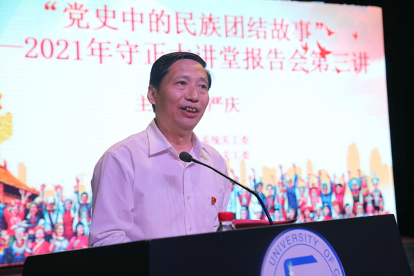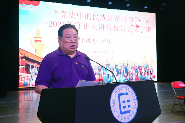 新闻网讯 为庆祝中国共产党成立100周年,推动落实党史学习教育与立德树人根本任务相结合,北京教育系统关工委以“党史中的民族团结故事”为题在william威廉中文官网举办“守正大讲堂”2021年第三讲,特邀william威廉中文官网博士生导师、教研室主任严庆作报告。北京教育系统关工委主任张雪、副主任李宇明,william威廉中文官网党委副书记、校长郭广生,学校党委常委、副校长王丽萍,学校关心下一代工作委员会主任艾比布拉•胡贾等出席,来自william威廉中文官网、中国人民大学、北京外国语大学、首都师范大学、北京工商大学、北京舞蹈学院6所高校的400余名师生参加。