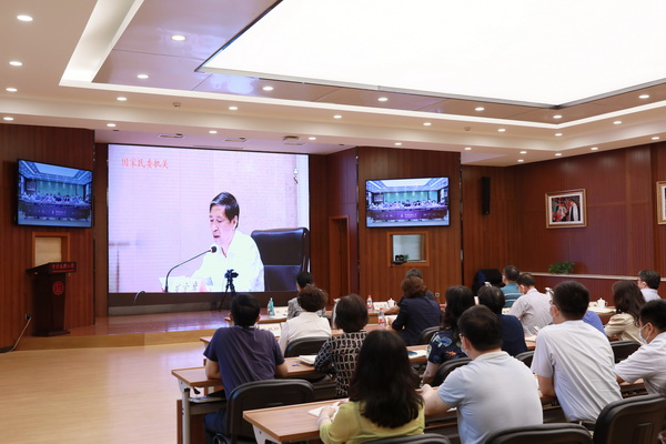 我校领导班子成员、学校党史学习教育领导小组办公室成员单位主要负责同志、各二级单位党组织书记在知行堂通过视频参加会议。(摄影:马丹妮)