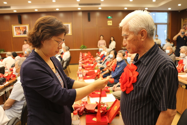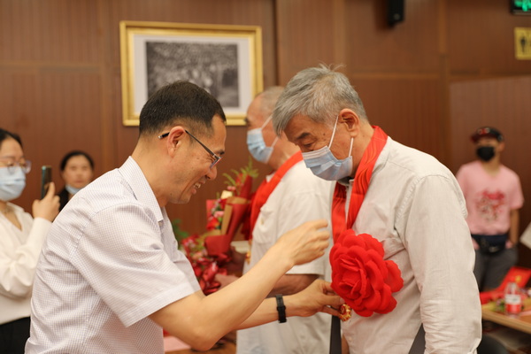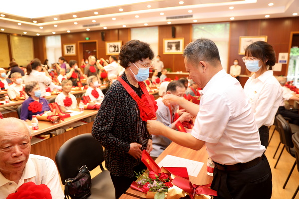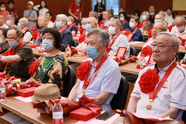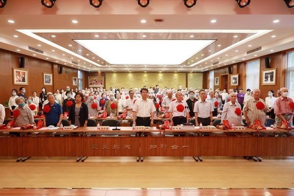 6月25日下午,学校在知行堂举行“光荣在党50年”纪念章颁发仪式。包括李耀宗、崔立群在内的78名老党员代表,在现场依次接受纪念章,同唱国歌,并在原党委书记周兴健领誓下重温入党誓词。
