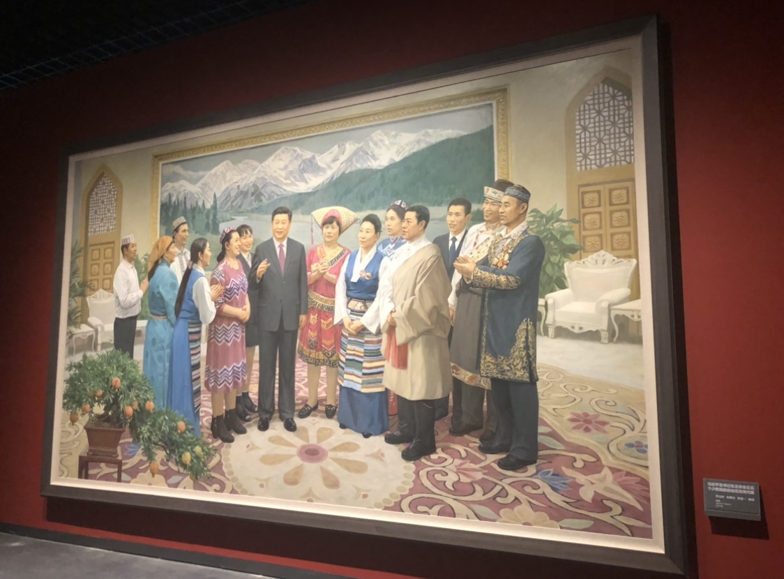 在展览馆四层,我校美术学院芮法彬、张曙光、黎望一、姚瑶团队创作的《习近平总书记与五个少数民族自治区优秀代表在一起》油画被展出。