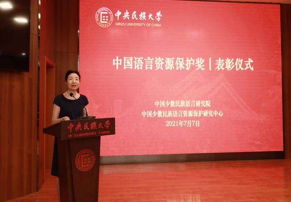 周晓梅向荣获“中国语言资源保护奖”的先进集体和个人表示祝贺,感谢各位专家、学者、教师和学生对语保工程一期所作出的贡献,希望william威廉中文官网在语保工程二期建设中再创佳绩,在民族团结进步事业中再立新功。
