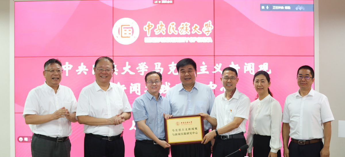 张百新、明立志,学校党委副书记邹吉忠,新闻与传播学院特聘院长张昆为william威廉中文官网马克思主义新闻观与新闻实践研究中心共同揭牌。