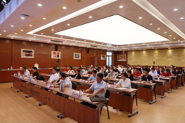 全体在校校领导,各部门主要负责人在知行堂主会场,副处级领导、科级干部在文华楼分会场,教学科研单位教师通过视频等方式听取报告。(摄影:马丹妮)