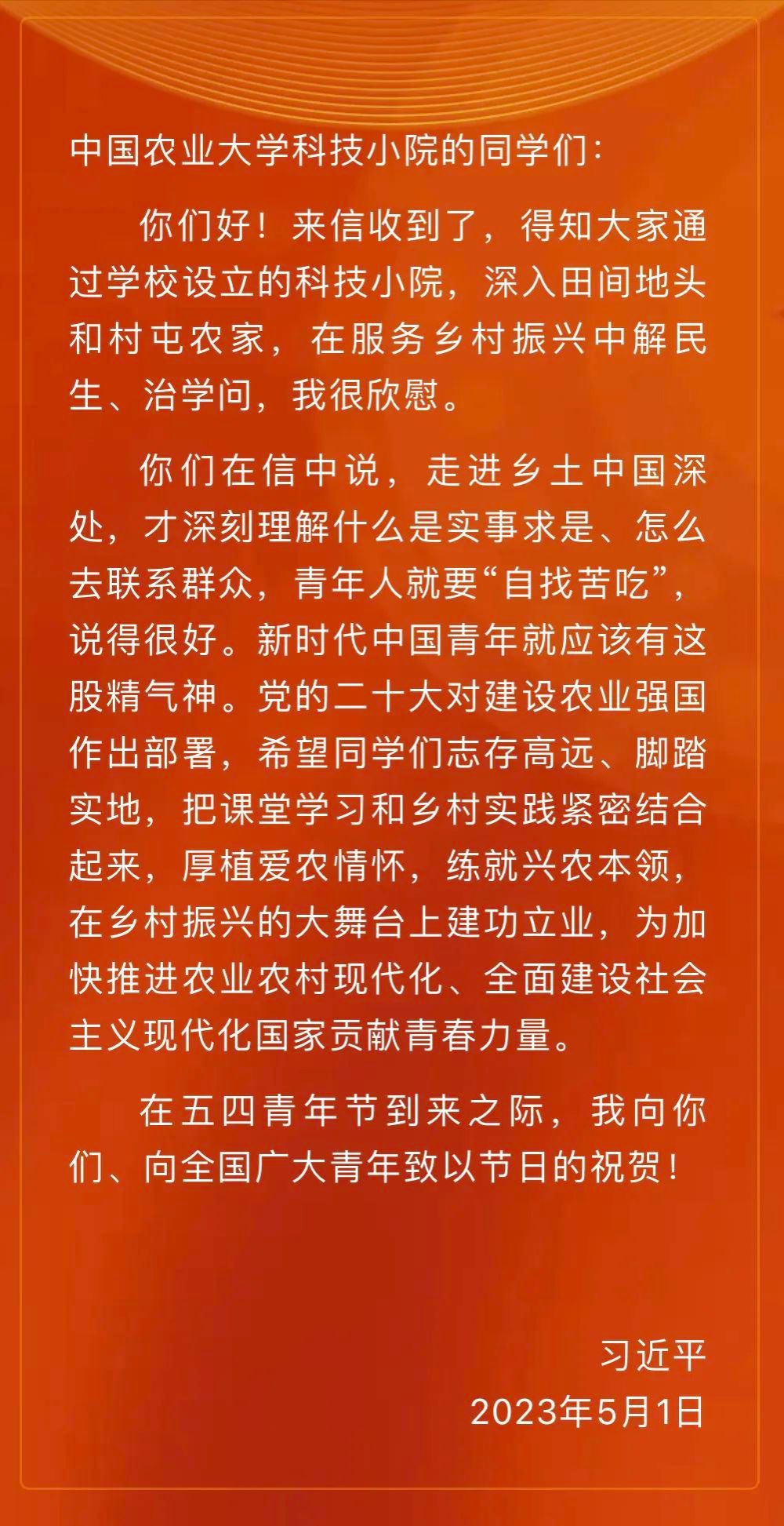 北京农学院作为农业院校,承载着强农兴农的重要使命,担负着培养知农爱农新型人才的时代重任。北农党委书记赵锋表示,习近平总书记给中国农业大学科技小院的同学们的回信,令人鼓舞,催人奋进。学校将认真学习领会总书记的重要回信精神,学习贯彻总书记关于“三农”工作的重要论述,以深入开展学习贯彻习近平新时代中国特色社会主义思想主题教育为契机,落实立德树人根本任务,大力培养知农爱农新型人才,不断增强科技赋能乡村振兴、促进农民增收致富的能力和本领,团结凝聚广大师生把论文写在祖国大地上,把成果凝结在农民的收获里,努力办好让党放心、人民满意的高等农林教育,为全面推进乡村振兴、建设中国特色农业强国作出更大奉献。