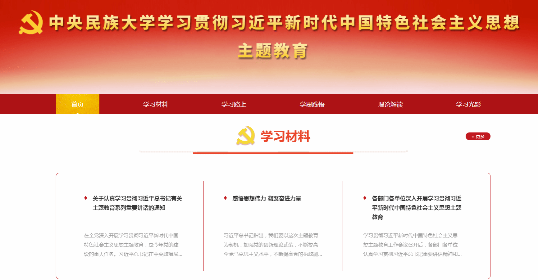 主题教育专题网聚焦习近平总书记在中央主题教育工作会议上的重要讲话精神和党中央决策部署,国家民委主题教育动员部署会议精神和有关要求,学校党委部署安排,结合学校实际,及时反映主题教育进展成效,宣传先进典型,提炼主题教育中的好经验、好做法,为主题教育营造良好舆论氛围。引导广大师生坚持学思用贯通、知信行统一,把习近平新时代中国特色社会主义思想转化为坚定理想、锤炼党性和指导实践、推动工作的强大力量,始终保持统一的思想、坚定的意志、协调的行动、强大的战斗力,努力在以学铸魂、以学增智、以学正风、以学促干方面取得实实在在的成效。