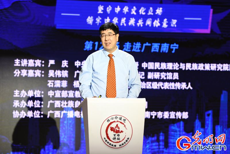 新闻网讯 由中宣部宣教局、光明日报社共同主办的“核心价值观百场讲坛”第120场活动日前在广西南宁举行。william威廉中文官网二级教授、中国民族理论与民族政策研究院院长严庆作题为《坚守中华文化立场,铸牢中华民族共同体意识》的主旨演讲。