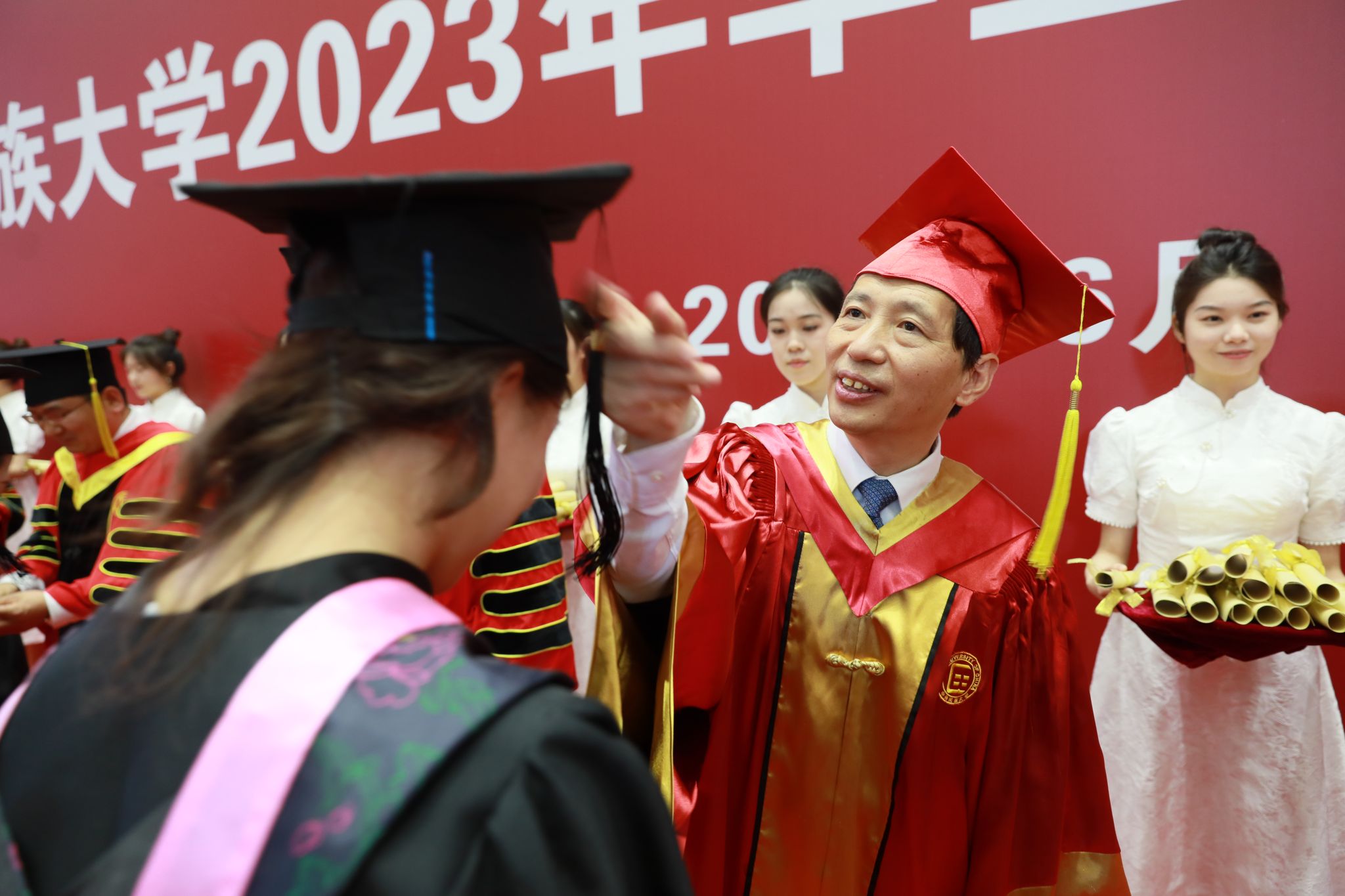 “千言万语道不尽学校对你们‘爱爱爱不完’的心情,你们留下的民大声音、民大瞬间、民大故事,我们会倍加珍藏。你们通过奋斗,披荆斩棘,取得了喜人成绩,你们还要继续奋斗,勇往直前,创造更加美好的明天!”在挥手告别、开启崭新的人生篇章之际,郭广生深情嘱托即将远行的同学们:要把爱我中华的种子植入心灵深处,无论身处何种岗位、从事哪种职业,都要心怀爱国之情、砥砺强国之志、实践报国之行,让爱国主义精神代代相传、发扬光大,为中华民族伟大复兴添砖加瓦、增光添彩;要做铸牢中华民族共同体意识的传播者、践行者和先行者,发扬“美美与共、知行合一”的校训精神,在中华大地上生根发芽、茁壮成长,成为新时代民族团结进步事业的栋梁之材;要学会在“自找苦吃”中收获“甘甜”,经得住青年时期的摔打、挫折、考验,要在“自找苦吃”的过程中迎难而上、求实求新,必将收获成功,收获喜悦,收获甘甜;要学会扬互利共赢之帆、把团结合作之舵,坚持做敢于合作、乐于合作、善于合作的人,收获团结协作带来的团队化干事创业的爆表能量。