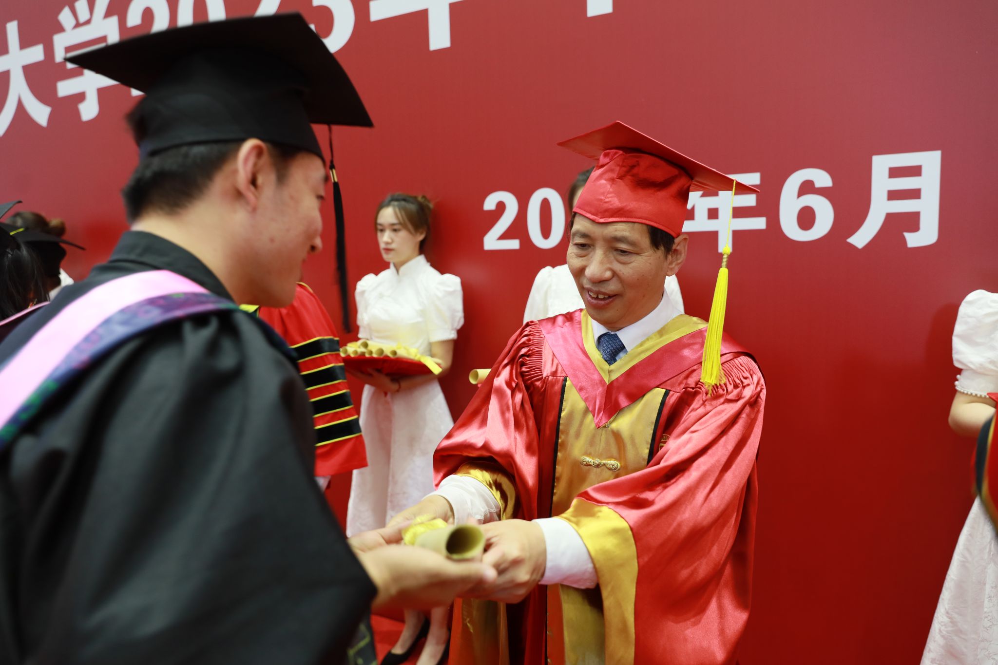 党委书记张京泽分别为博士、硕士和本科毕业生代表颁发毕业证书,并与他们合影祝贺。