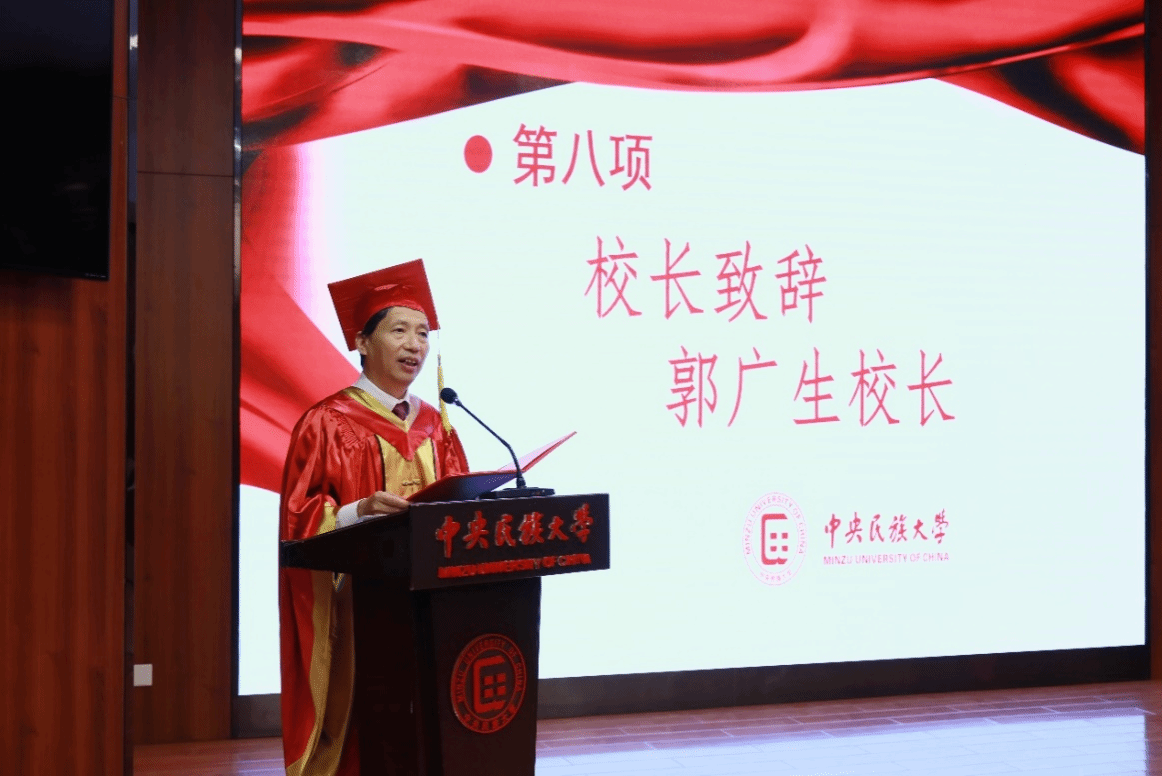 郭广生在致辞中深情回顾了首届中外合作办学项目学生四年的学习历程,这届毕业生见证了党和国家事业发展取得的伟大成就,见证了学校事业的高质量发展,体验了中外合作办学的魅力,这些都将成为宝贵的人生财富。郭广生寄语“今年学校送走的最后一批毕业生”,一要厚植家国情怀,未来不论身处何地,都始终赓续“我从延安来”的红色血脉,把深沉的家国情怀融进火热的青春,在“请党放心、强国有我”的铮铮誓言中,实现与祖国、与时代的“双向奔赴”;二要培树全球视野,扎根中国,放眼世界,以更大的担当和胸怀,有意识地强化引领未来中国发展的本领,淬炼参与全球事务的能力,努力成为具有国际竞争力的未来时代的引领者;三要砥砺奋斗精神,励志勤学、探索真知、追求卓越,做到理想坚定、信念执着、不怕困难、勇于开拓,做到“博学、明辨、审问、慎思、笃行”,用奋斗致敬这可贵的青春与伟大的时代,让青春在奋斗中绽放绚烂之花;四要勇担中华文化传播交流使命,能够时刻谨记“美美与共,知行合一”的校训,坚定中华文化自信,向世界更好地展示中华文化、中华文明,让世界各国人民更加充分地了解和认识中华五千多年一脉相承、历久弥新的优秀文化和灿烂成就,为建设中华民族现代文明、推动中国与世界各国文明交流互鉴作出积极贡献。