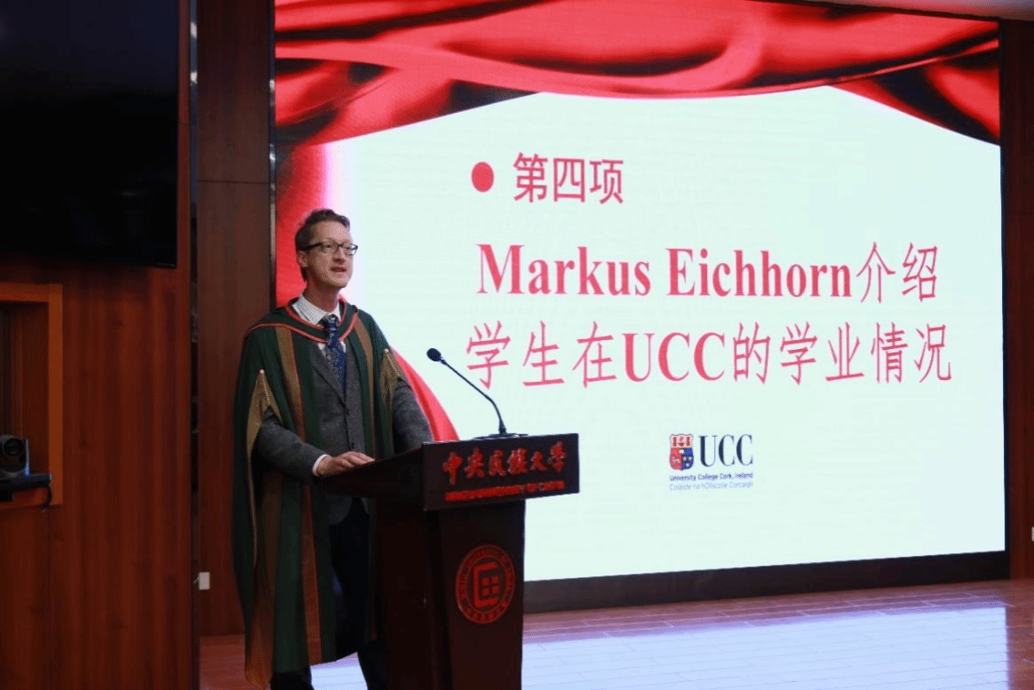 中外合作办学项目的外方负责人马库斯·艾奇霍恩介绍了中外合作办学2023届毕业生在爱尔兰国立科克大学的学业情况。