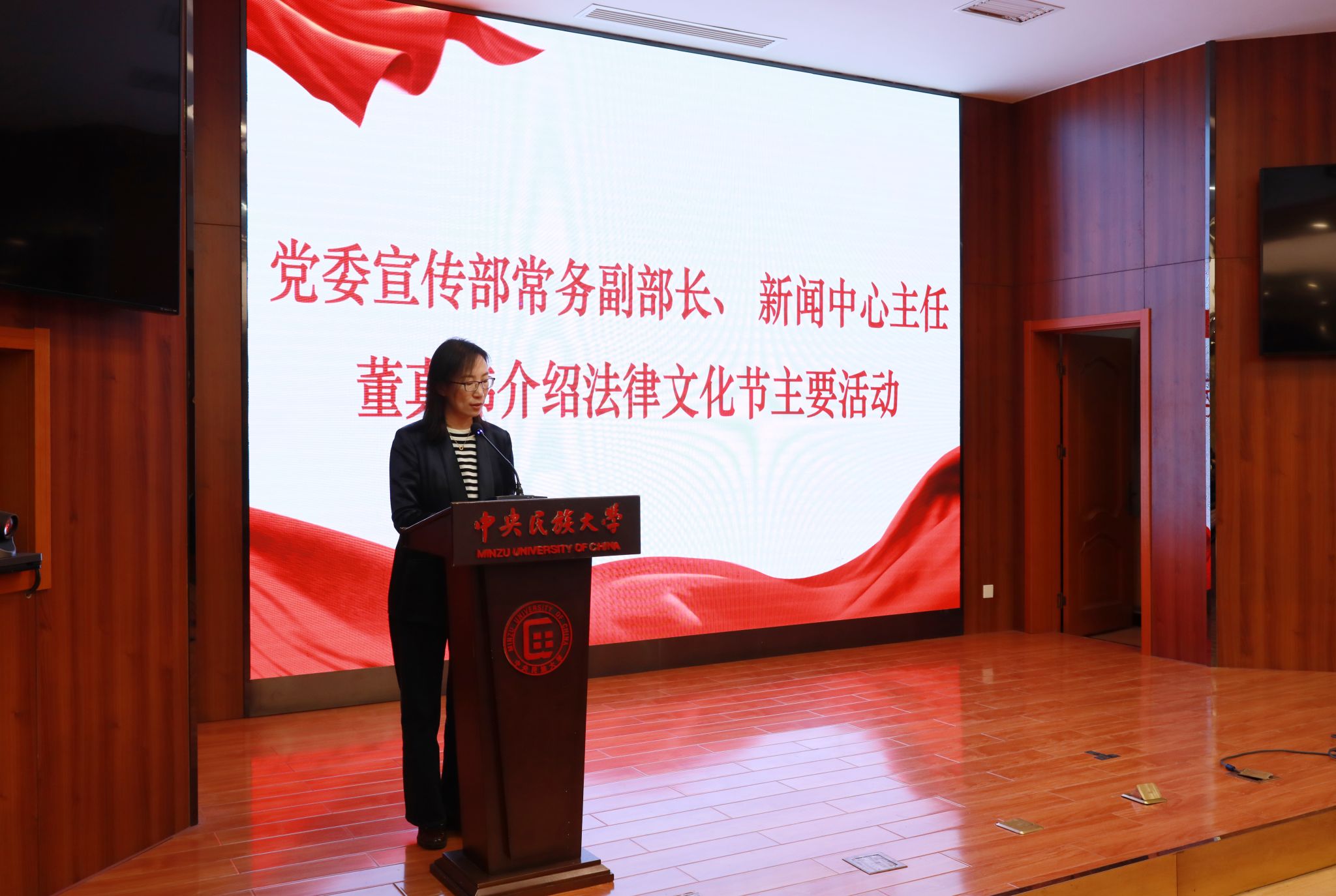 开幕式上,校党委宣传部常务副部长、新闻中心主任董真祎介绍了2023年法律文化节六大板块主要活动。