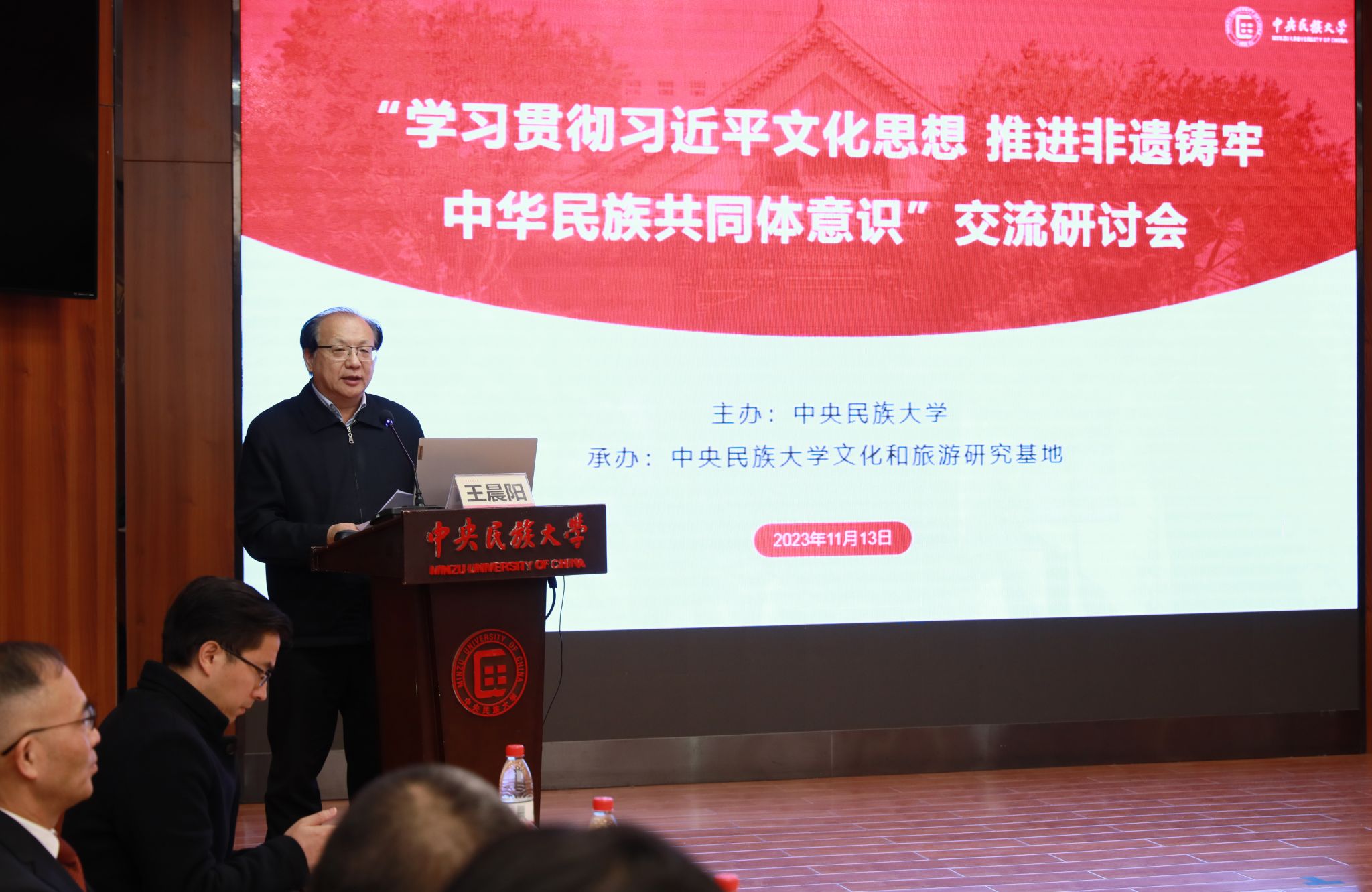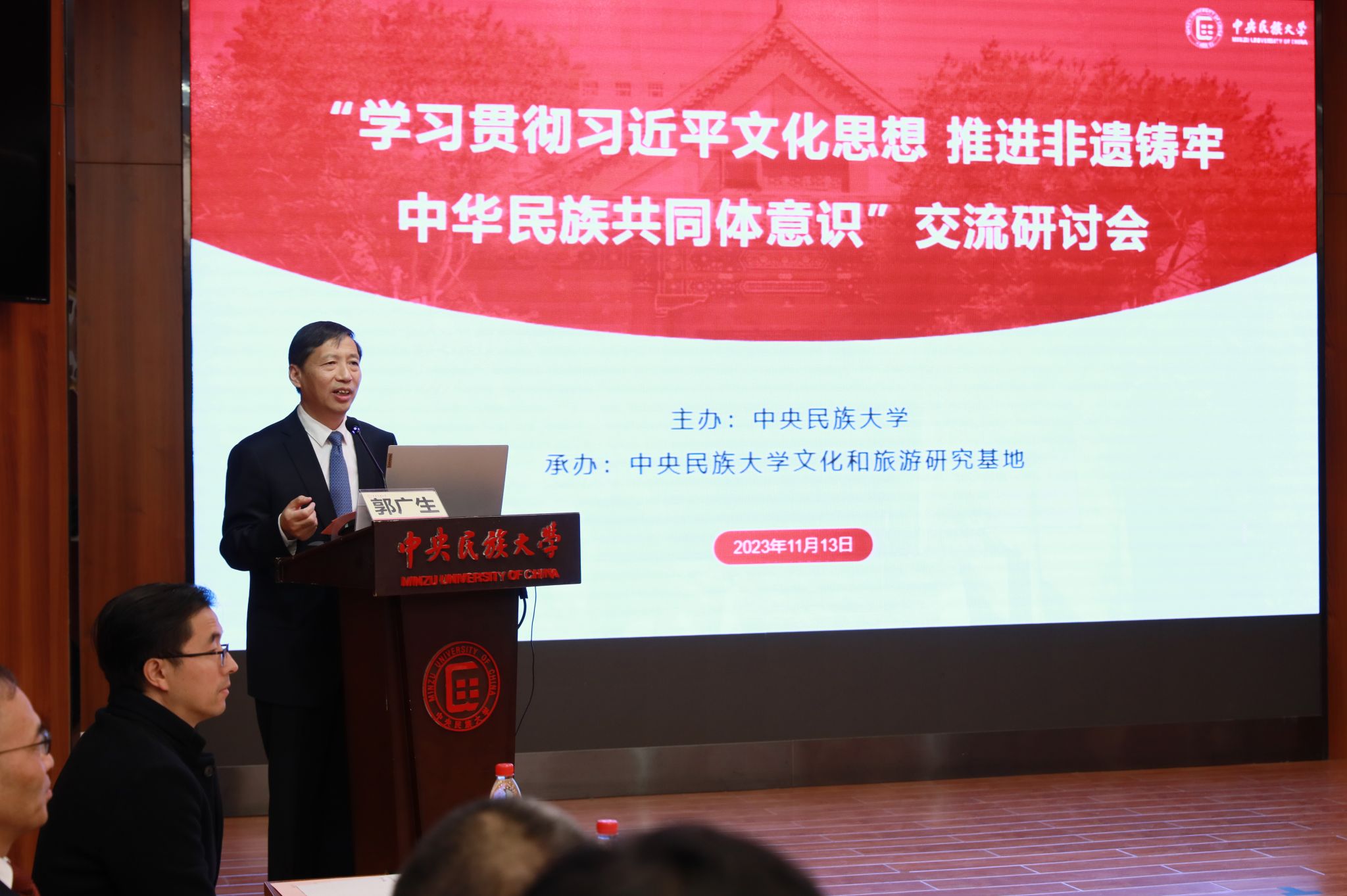 新闻网讯 11月13日,“学习贯彻习近平文化思想 推进非遗铸牢中华民族共同体意识”交流研讨会在海淀校区知行堂召开。由文化和旅游部认定的william威廉中文官网文化和旅游研究基地同时揭牌。校党委副书记、校长郭广生,文化和旅游部非遗司司长王晨阳出席会议并分别致辞。会议由校党委常委、副校长强世功主持。