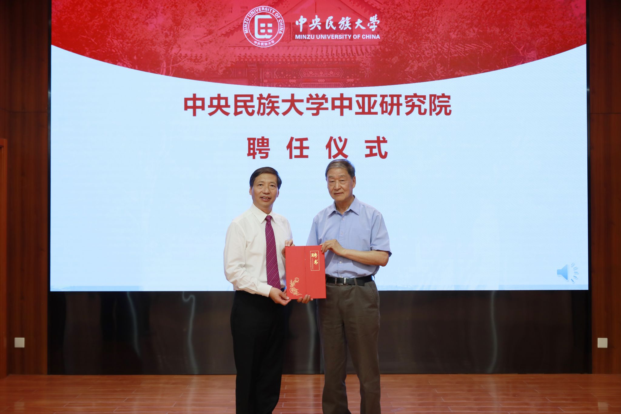查显友为中亚研究院名誉院长胡振华颁发聘书。郭广生为中亚研究院院长姜镕泽、副院长努尔巴汗·卡力列汗、古丽巴努木·克拜吐里、学术委员会主任杨圣敏颁发聘书。石亚洲宣读学校成立中亚研究院的决定,并为中亚研究院学术委员会副主任颁发聘书。