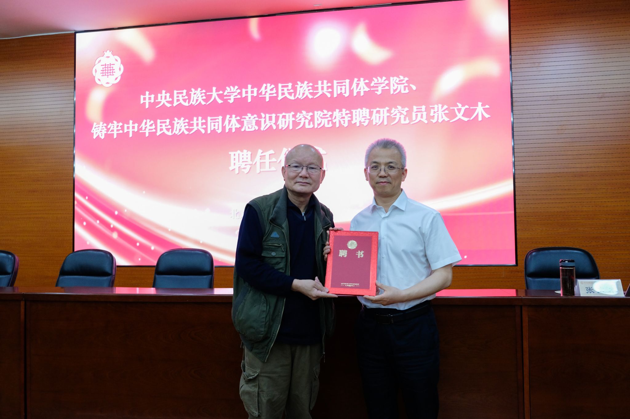 新闻网讯 5月9日,中华民族共同体学名家大讲堂系列课程第十一讲“旧邦新命:马克思主义与中国优秀传统文化结合及其世界意义”在海淀校区文华楼一层报告厅举办。讲座由校党委常委、副校长强世功主持,北京航空航天大学战略问题中心研究员张文木担任主讲嘉宾。讲座开始前,强世功副校长向张文木教授颁发了中华民族共同体学院、铸牢中华民族共同体意识研究院特聘研究员聘书。