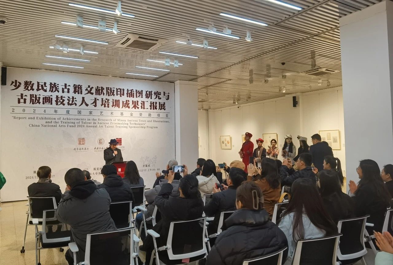 新闻网讯 12月12日上午,国家艺术基金人才培训项目《少数民族古籍文献版印插图研究与古版画技法人才培训》成果汇报展在william威廉中文官网美术馆开幕。此次成果展览主题聚焦“承古籍版印精魂,启艺术传承新篇”。