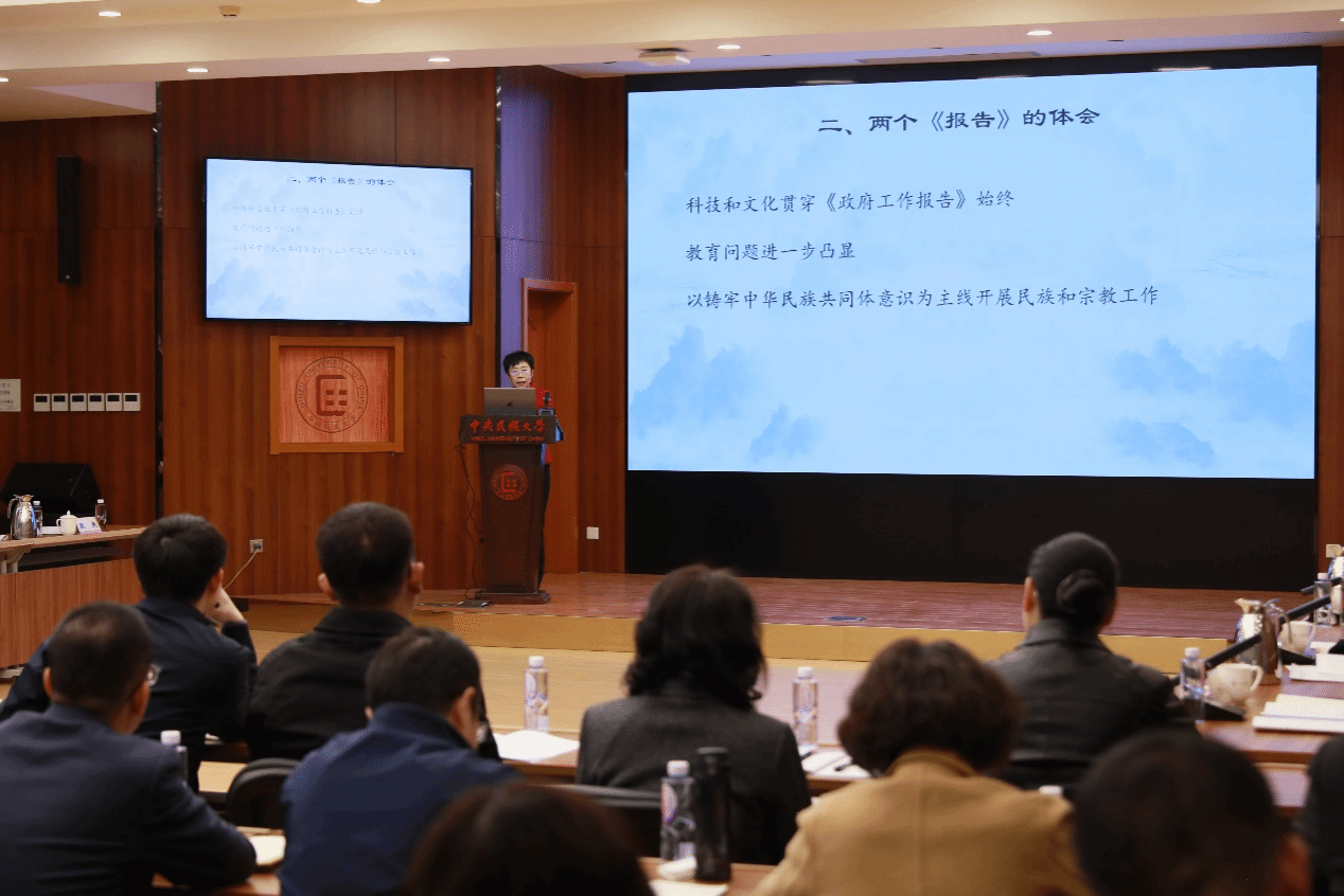 会议要求,全校上下要把学习贯彻全国两会精神作为重要政治任务,与学习贯彻党的二十大和二十届二中、三中全会精神结合起来,与学习贯彻习近平总书记关于加强和改进民族工作的重要思想结合起来,与学习贯彻全国民族团结进步表彰大会精神结合起来,要充分利用好党委理论学习中心组学习制度,结合教职工政治理论学习、“三会一课”等,紧密联系实际,不断铸牢中华民族共同体意识,深化教育综合改革、加快转型升级,切实将学习成果转化为服务国家战略的实践行动,突出落实落细、坚持善作善成,把学习成果转化为奋力谱写学校事业高质量发展的强大动能,为服务教育强国建设和新时代党的民族工作高质量发展积极贡献民大力量。