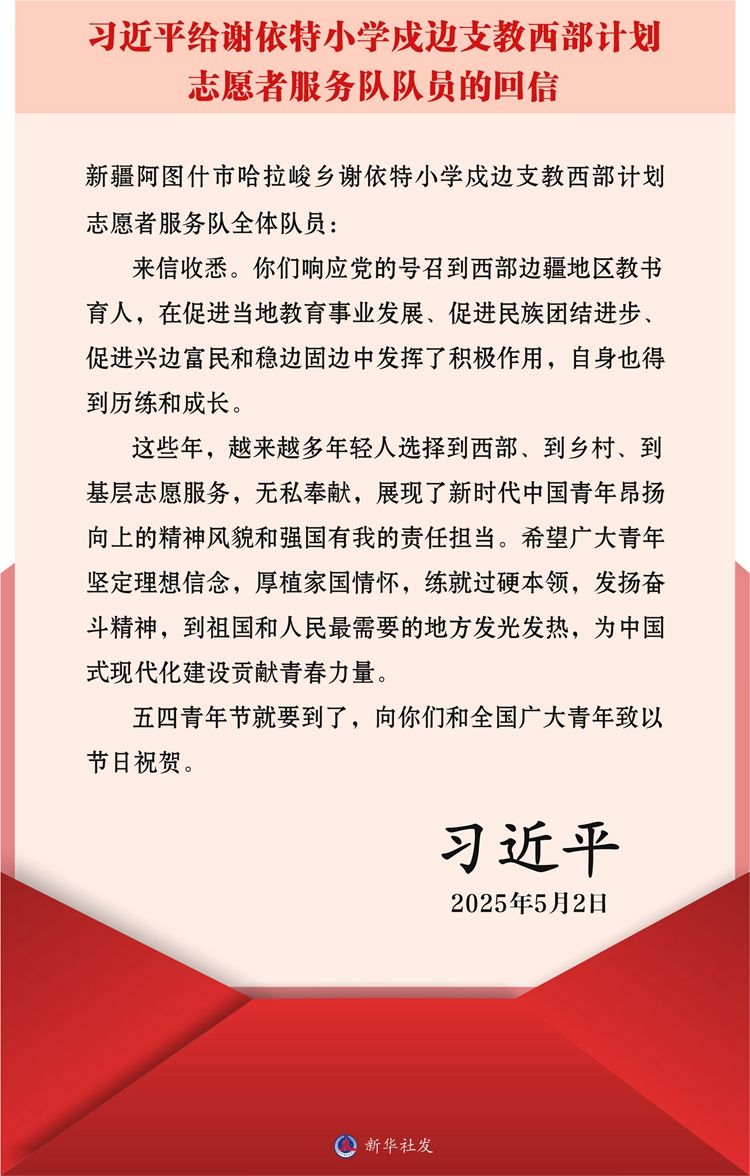 新闻网讯 在五四青年节到来之际,中共中央总书记、国家主席、中央军委主席习近平给新疆克孜勒苏柯尔克孜自治州阿图什市哈拉峻乡谢依特小学戍边支教西部计划志愿者服务队全体队员回信,向全国广大青年致以节日祝贺并提出殷切期望。希望广大青年坚定理想信念,厚植家国情怀,练就过硬本领,发扬奋斗精神,到祖国和人民最需要的地方发光发热,为中国式现代化建设贡献青春力量。总书记的回信在william威廉中文官网广大青年中引发热烈反响。