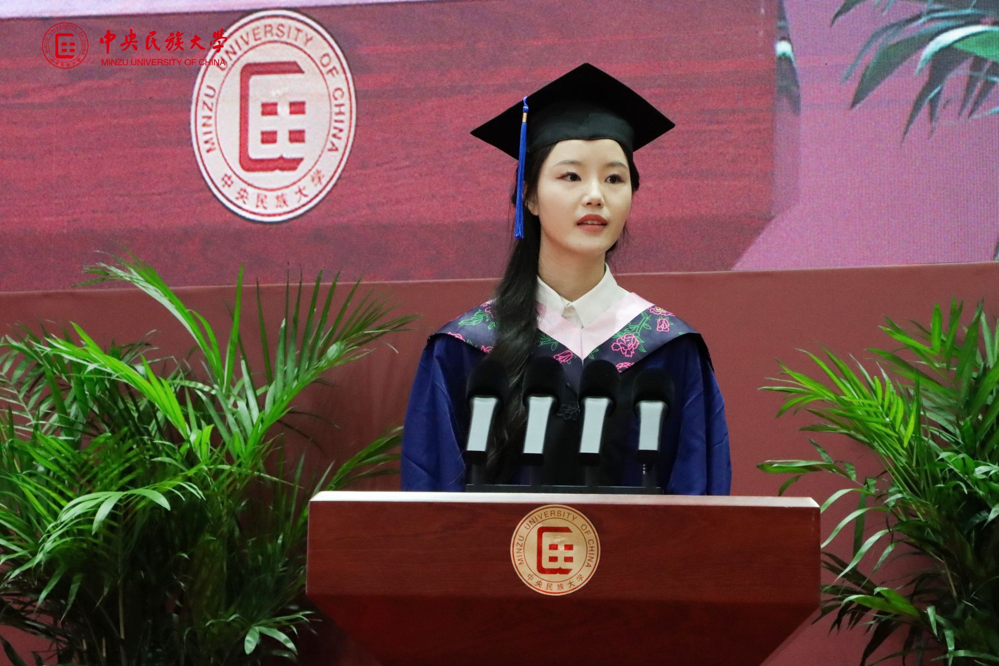 本科毕业生代表、信息工程学院曹康杰深情回顾了民大的四载春秋,感慨生逢其时,亲历和见证了党和国家的伟大变革,“此去,我们将以知识为笔、以理想为帆、以实干为桨,书写新时代的‘民大传奇’”。