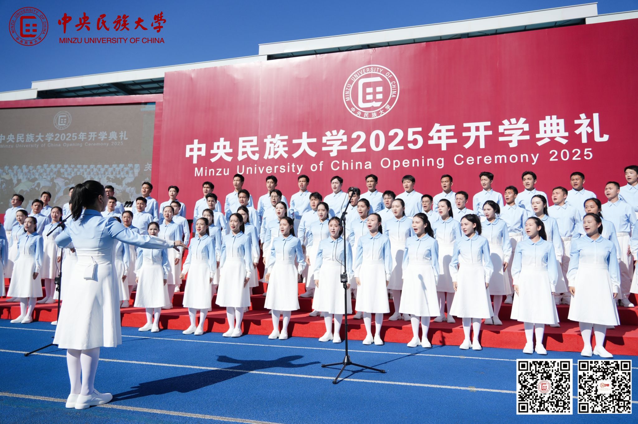 仪式前,参加纪念中国人民抗日战争暨世界反法西斯战争胜利80周年大会广场合唱团的师生代表,为现场新生演唱了《松花江上》《太行山上》《保卫黄河》《没有共产党就没有新中国》等经典歌曲。