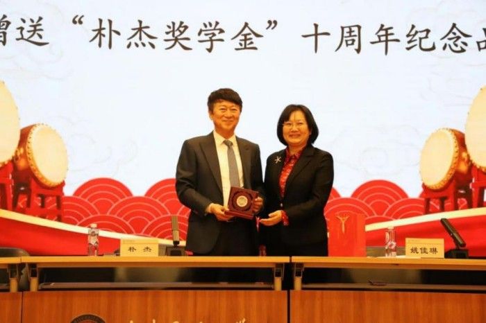 姚佳琳代表学校向朴杰董事长赠送“朴杰奖学金”十周年特别纪念品,以此致敬朴杰董事长和可喜安集团十载如一日对学校教育事业的支持。她指出,“朴杰奖学金”从最初的专项资助,通过不断拓展资助内涵、深化育人机制,逐步形成覆盖全校所有学院,囊括学业深造、科研创新、社会实践和管理服务的综合激励项目,它既承载着朴杰先生的殷切期望,也凝聚着学校对各民族师生的深情嘱托。新十年开启,学校将继续与可喜安集团深化合作,让更多优秀师生受益。同时,也希望获奖师生以感恩之心传承爱心回馈社会;以进取之志深耕学业追求卓越;以务实之风践行时代使命。