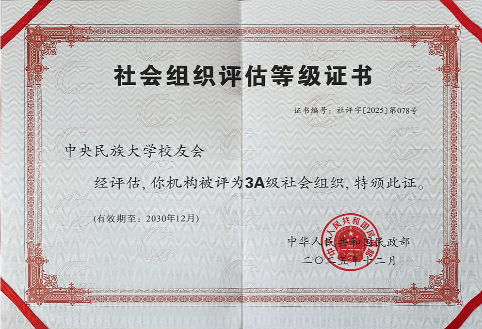 获评3A等级,是对校友会过往工作的有力肯定,更是全体民大校友凝心聚力的成果见证。今后,校友会将以此次评估为契机,始终聚焦铸牢中华民族共同体意识工作主线,继续坚持与校友协同发展的理念,进一步团结凝聚广大校友,为新时代党的民族工作和学校各项事业高质量发展贡献更大的智慧和力量。