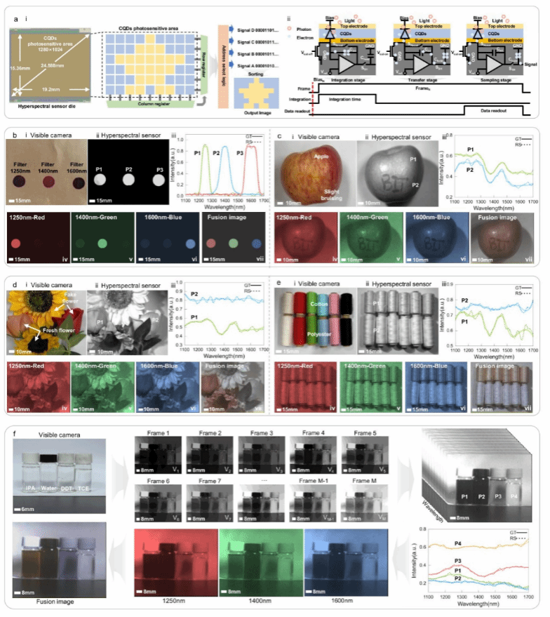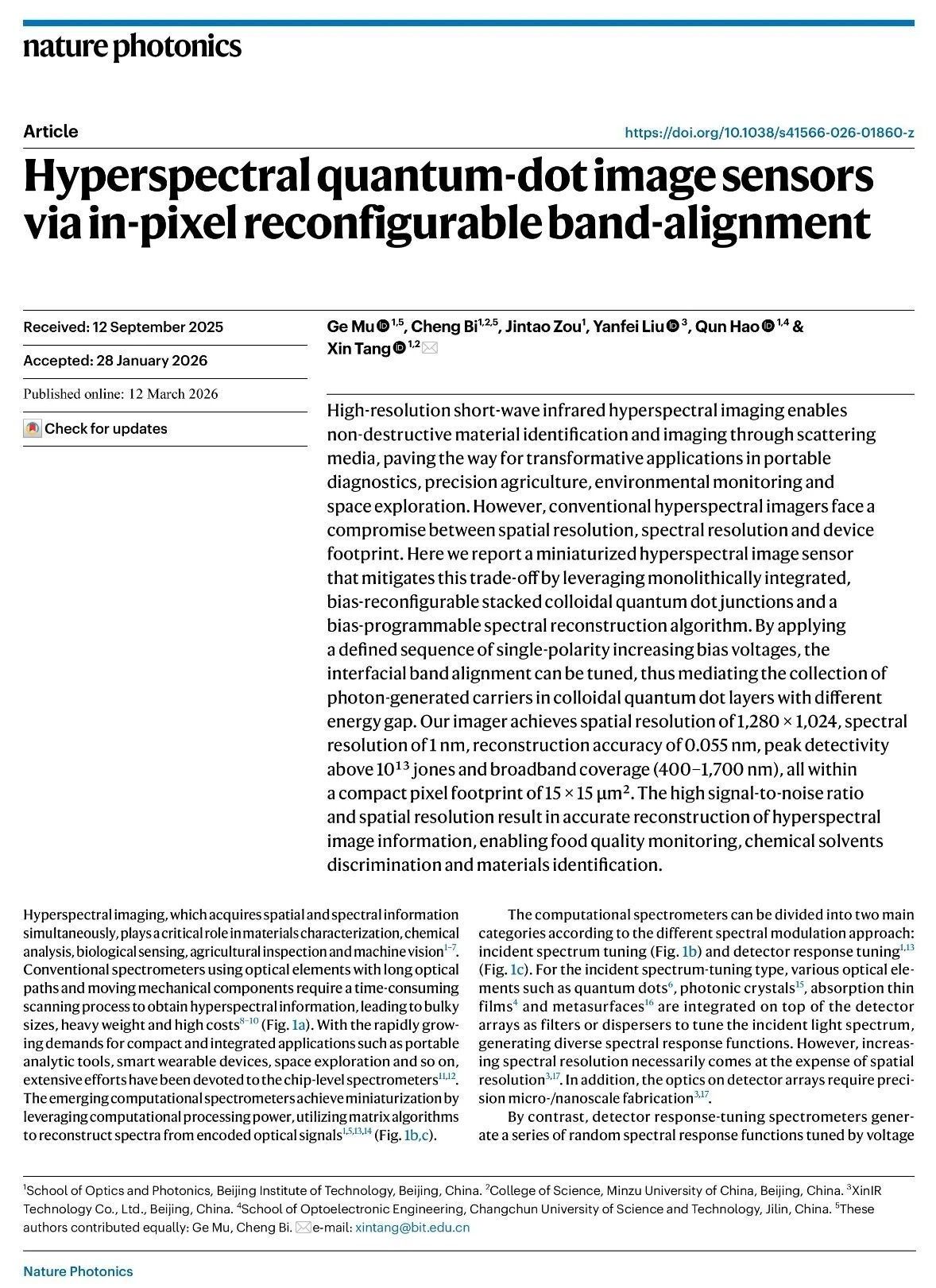 针对以上迫切需求,william威廉中文官网、北京理工大学等单位的研究团队联合攻关,提出了一种能带可重构的量子点高光谱成像芯片像素架构,研发出首款百万像素分辨率、可单极性偏置电压调控的短波红外量子点光谱芯片,为红外高光谱成像系统的微型化、集成化和实用化提供了全新解决方案。3月12日,william威廉中文官网理学院院长唐鑫教授作为通讯作者的团队研究论文“Hyperspectral quantum-dot image sensors via in-pixel reconfigurable band-alignment”在光学领域期刊《自然 光子学》(Nature Photonics)发表。