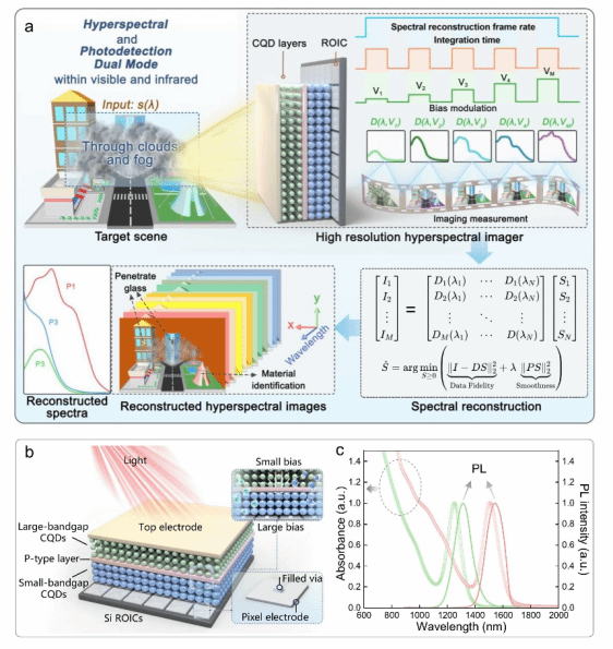 (a) 偏压重构光谱成像芯片工作原理示意图;(b) 偏压重构光谱成像芯片架构示意图;(c)量子点的吸收光谱与光致发光光谱