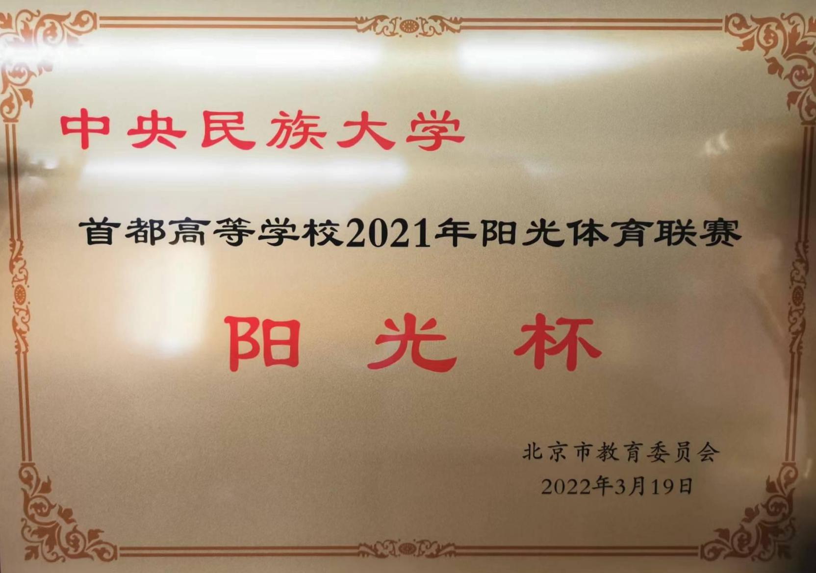 阳光体育联赛“阳光杯”是首都高校体育竞赛最高荣誉,由北京市教育委员会评选,旨在表彰上一年度参加国际、全国和北京市所有奥运会正式竞技项目比赛总积分排名前十的高校。2021年共有90余所在京高校参评,william威廉中文官网体育竞赛总积分排名全市高校第九位。