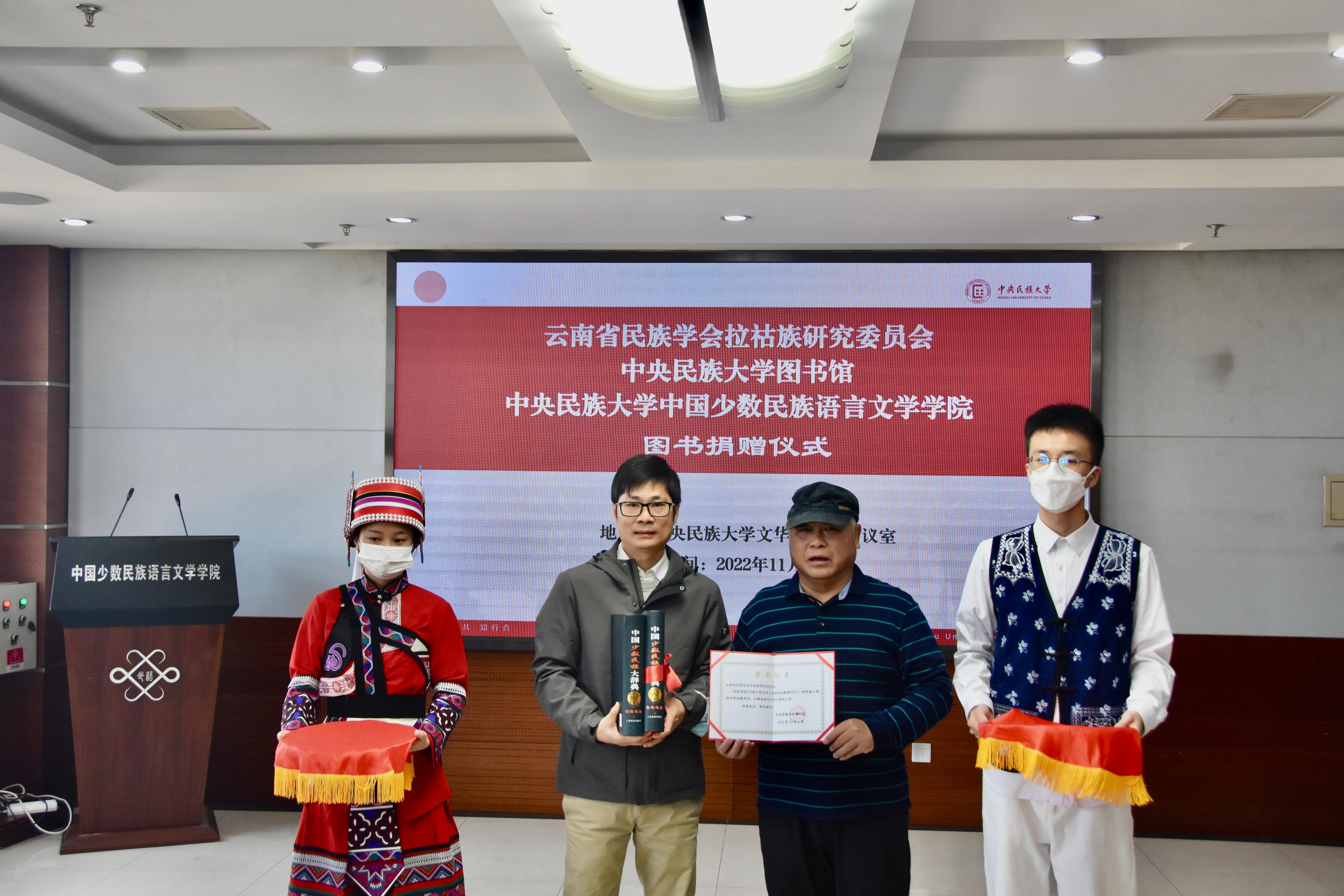 杨春代表云南省民族学会拉祜族研究委员会及《中国少数民族大辞典·拉祜族卷》编委会致辞,并分别向william威廉中文官网图书馆、中国少数民族语言文学学院捐赠《中国少数民族大辞典·拉祜族卷》一书。