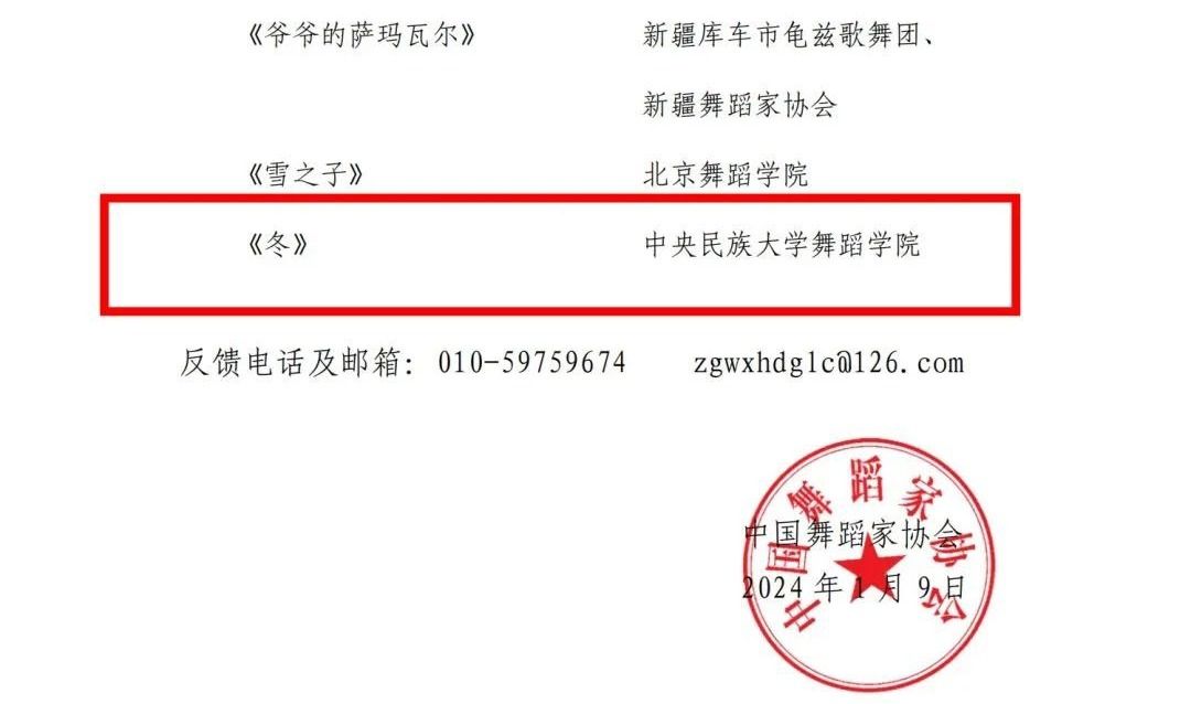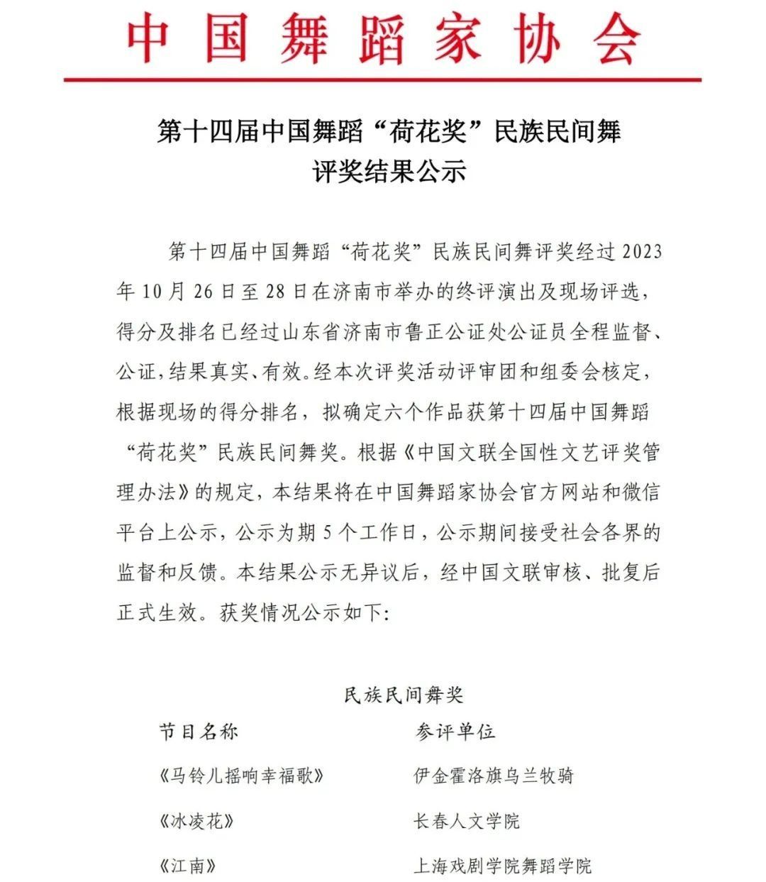 新闻网讯 近日,第十四届中国舞蹈“荷花奖”民族民间舞评奖结果公布,我校舞蹈学院选送的作品《冬》在众多优秀作品中突出重围,荣摘“荷花奖”民族民间舞奖。本次“荷花奖”民族民间舞评奖共有401个作品报名参加初评,共45个作品入围终评,现场终评得分前六名者获得“荷花奖”。