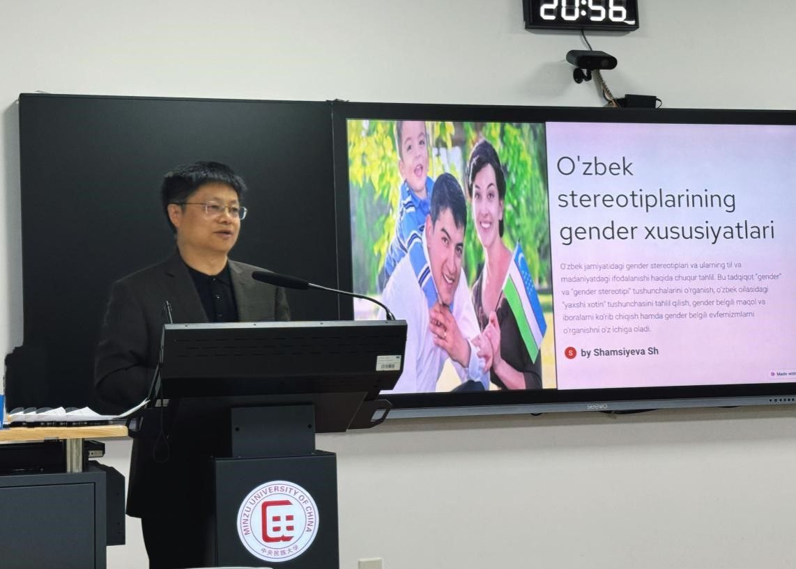 莎赫斯塔洪·沙姆谢耶娃学习中文近20年,她用中文向同学们解释了乌兹别克语言中“定型化”现象,从语言学的角度分析了某些特定的词汇使用特点,以丰富的例子诠释了乌兹别克斯坦社会中存在的文化思维模式。
