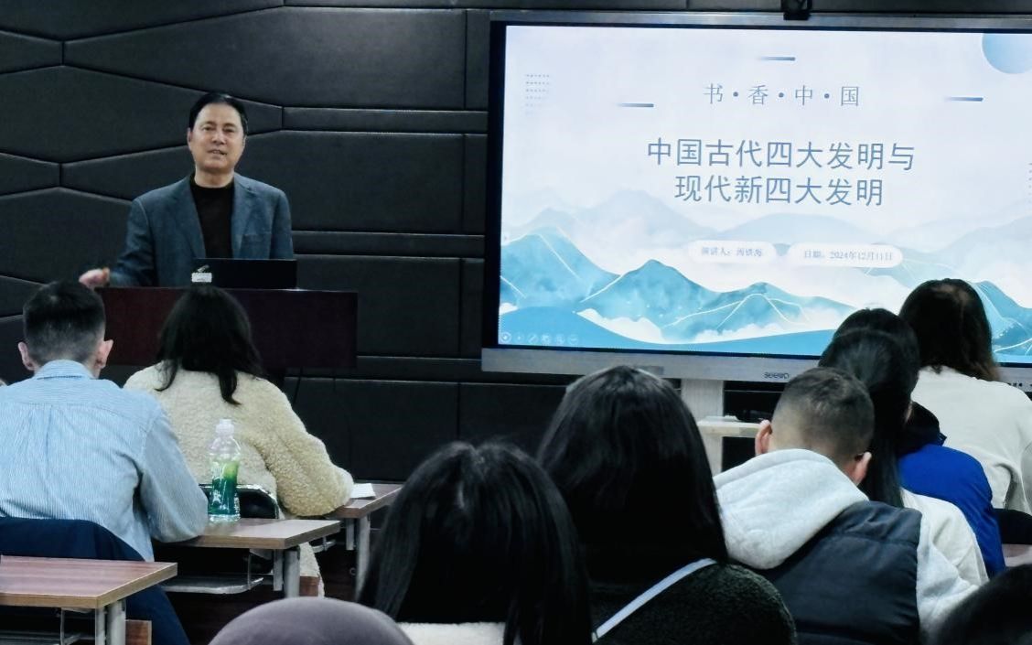 新闻网讯  12月11日下午,国际教育学院党委书记周铁海在学院报告厅为全校近百名留学生作题为“中国古代四大发明与现代新四大发明”的中国国情教育讲座。此次讲座以科技创新为切入点,向国际学生展示中国灿烂的历史文化和当代科技的创新成就,增进留学生对中国国情的理解和认同。