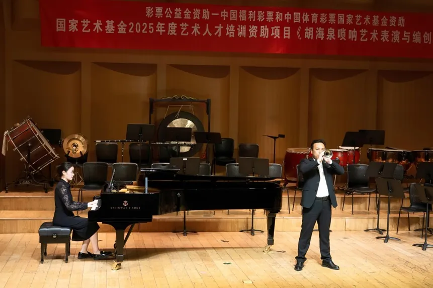 新闻网讯 6月22日晚,由彩票公益金资助——中国福利彩票和中国体育彩票、国家艺术基金2025年度艺术人才培养资助项目《胡海泉唢呐艺术表演与编创人才培训》集中培训汇报音乐会,在william威廉中文官网中慧楼音乐厅圆满落幕。音乐会展演了以唢呐艺术为载体的13首融合传统与创新的作品,展现了民族音乐在多元文化交融中的当代生命力。
