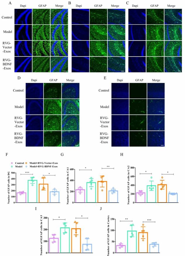 进一步研究发现,RVG-BDNF-Exos不仅能够减少抑郁样行为小鼠脑部的小胶质细胞数量,缓解神经炎症,还显著降低了星形胶质细胞的数量,这些结果进一步表明其对抑郁症有显著的治疗潜力(图4-5)。