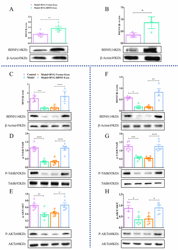 为评估RVG-BDNF-Exos在大脑中递送BDNF的效果,研究人员使用抑郁样行为小鼠进行了实验。结果显示,接受RVG-BDNF-Exos治疗的小鼠在海马和前额叶皮层区域的BDNF蛋白水平显著提高,并激活了下游信号通路,减少了炎症反应,证明了工程化外泌体在体内激活了BDNF信号通路(图2)。