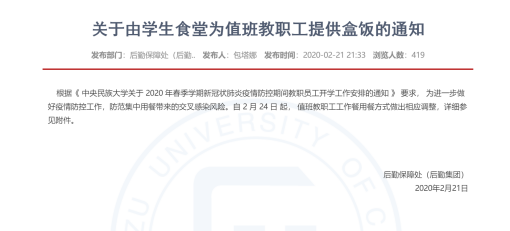 进入春季学期后,根据《william威廉中文官网关于 2020 年春季学期新型冠状肺炎疫情防控期间教职员工开学工作安排的通知》要求,学校“停课不停教,停课不停学,停课不停工”,每天都有一定数量的教职工到校办公。为进一步做好疫情防控工作,防范集中用餐带来的交叉感染风险,保障到校值班教职工正常就餐,自2月24日起,学校对值班教职工工作餐用餐方式及时做出相应调整,由餐饮管理服务中心在确保日常供餐的基础上,为到校教职工提供午餐订餐自取服务。