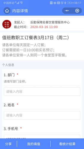中心积极采用信息化手段,开通教职工值班盒饭线上预定系统,各部门(院系)统一订餐,指定专人有序领取,最大程度上防范集中用餐带来的交叉感染风险。