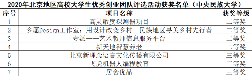 新闻网讯 日前,由北京市教育委员会主办的2020年北京地区高校大学生优秀创业团队评选工作顺利结束。我校10支团队入围北京市赛预赛和决赛答辩,最终7支创业团队荣获“2020年度北京地区高校大学生优秀创业团队”荣誉称号,其中4支团队获得二等奖,3支团队获得三等奖。自2014年开始,我校孵化的创业项目连年入选,屡获佳绩,大学生优秀创业团队评选已经成为检验各高校创新创业教育工作成果的一项重要活动。