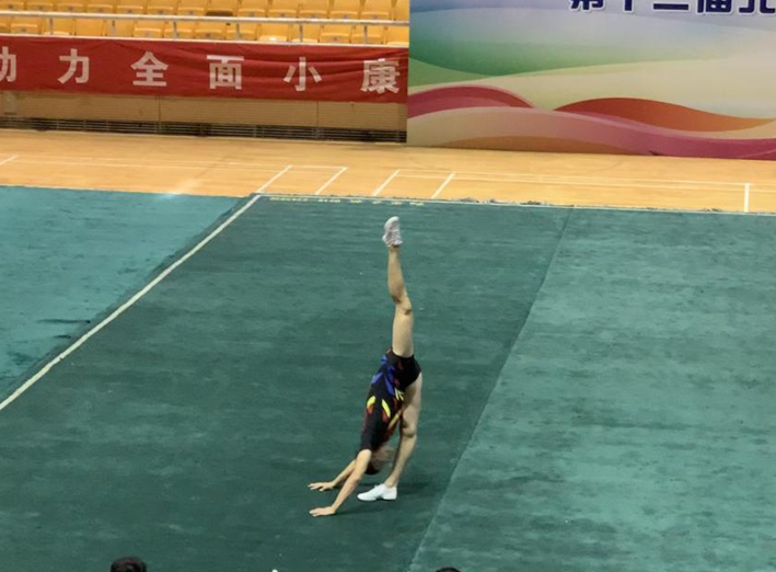 我校健美操队参加了此次比赛徒手健身操舞——中华家园、轻器械健身操舞——弹力绳和男子单人自选三个项目的比赛。队员们凭借着出色的发挥以及精彩的亮相,分别以9.46分、9.50分和18.90分斩获了三个项目的冠军。