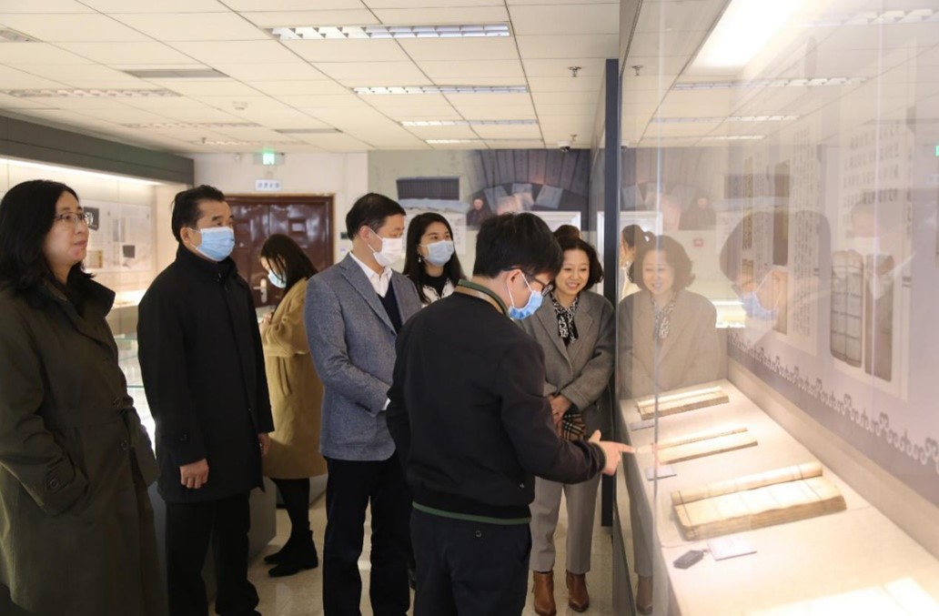 新闻网讯 11月12日下午,教育部“高等学校公共管理类专业教学指导委员会”华中科技大学副校长许晓东、北京大学政府管理学院教授句华、广东外语外贸大学政治与公共管理学院院长彭未名、教育部公共管理专业教指委秘书处办公室人员章琼丹、北京大学教师白一芳一行到我校图书馆“民族记忆·珍贵典藏”古籍特藏展参观考察。