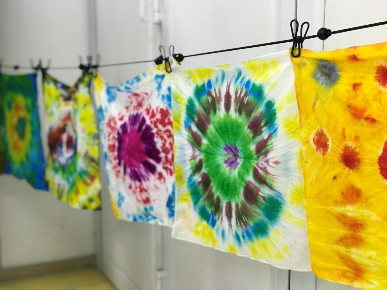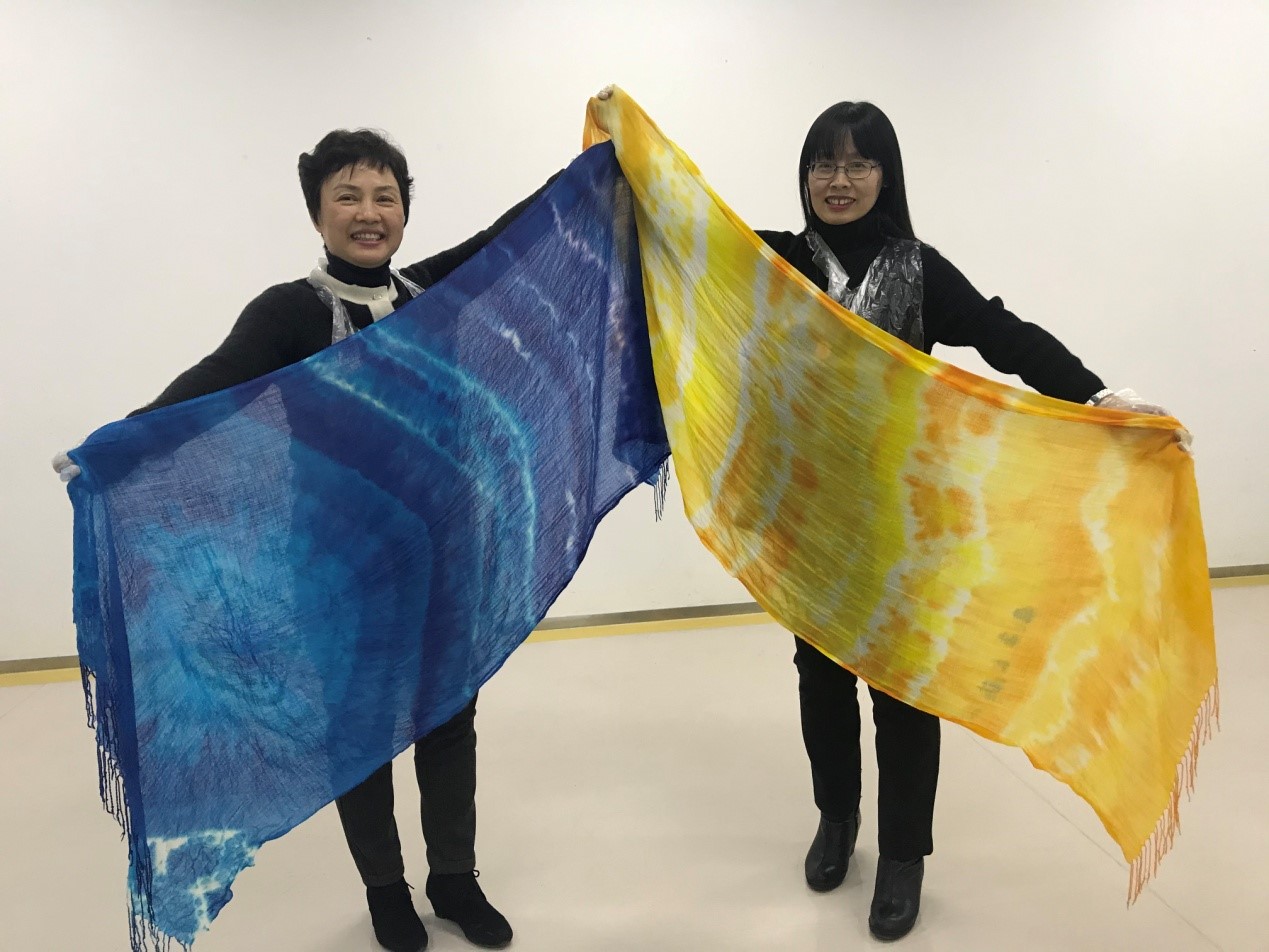 在周莹教授的指导下,协会成员从调配染料、手工染制到漂洗晾晒,一块普通的白布,经过浸湿、勒扎、涂染、晾干等环节,变为一件件艺术品,图案千姿百态、若隐若现、韵味别致。 生动的艺术实践课将传统文化融入现代生活中,使老师们在实践中感受到了民族自豪感和文化认同感。