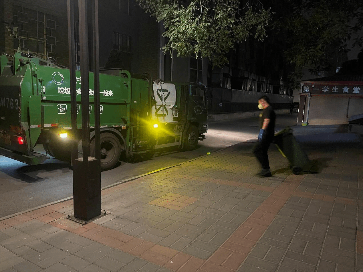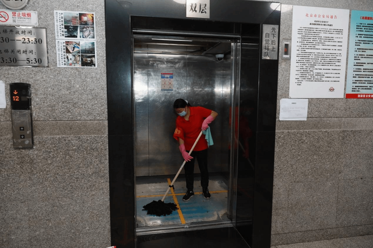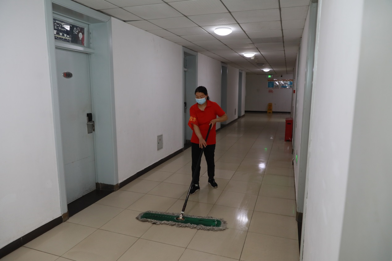 ▲学生1号公寓的保洁员在各个区域进行消杀工作