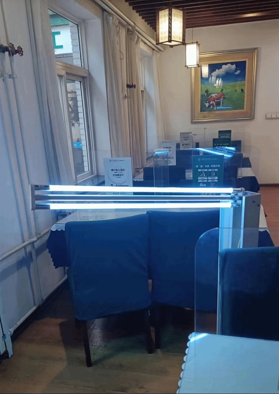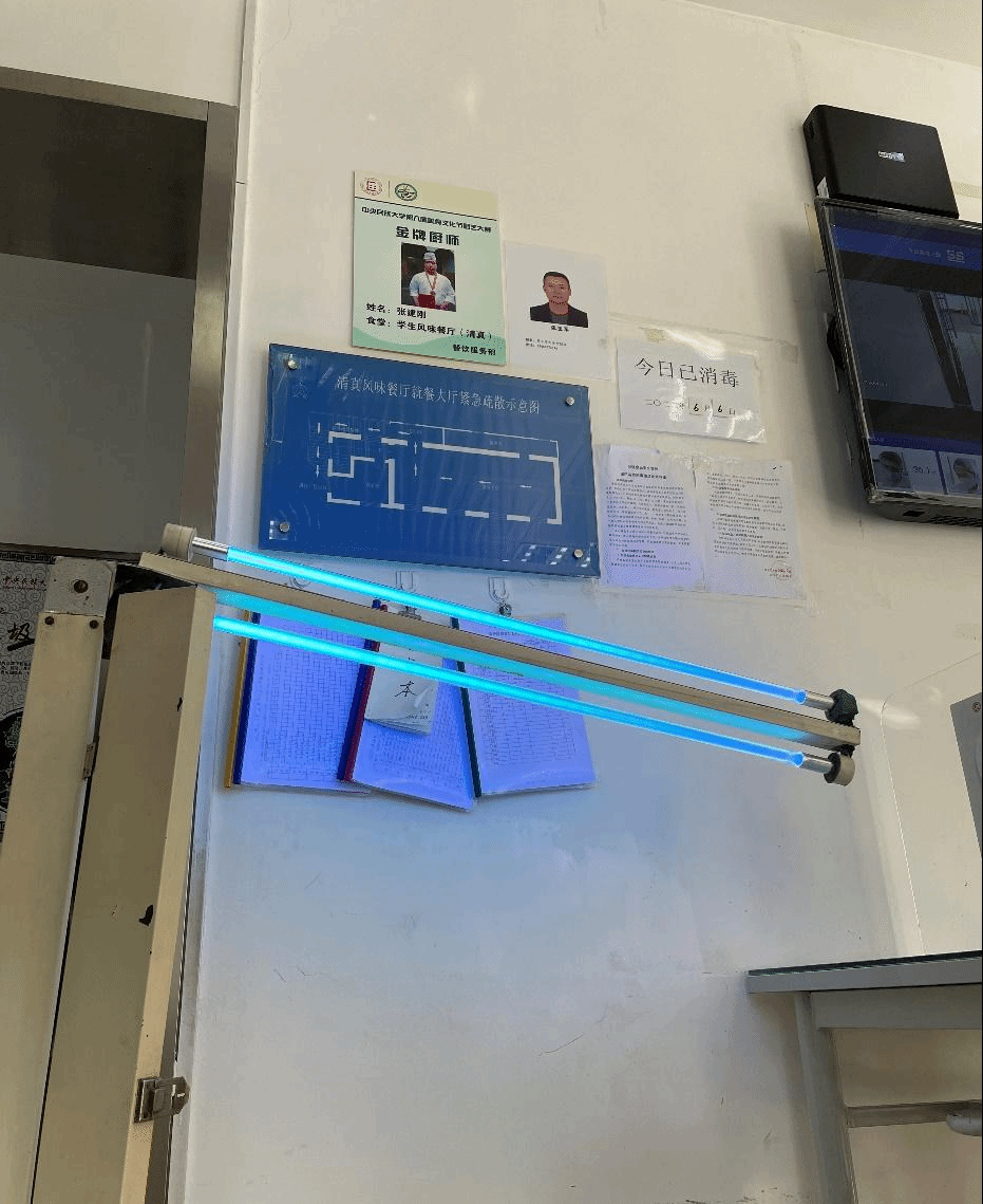 ▲每日对食堂及周边进行早、中、晚三次紫外线消毒并填写消毒记录表