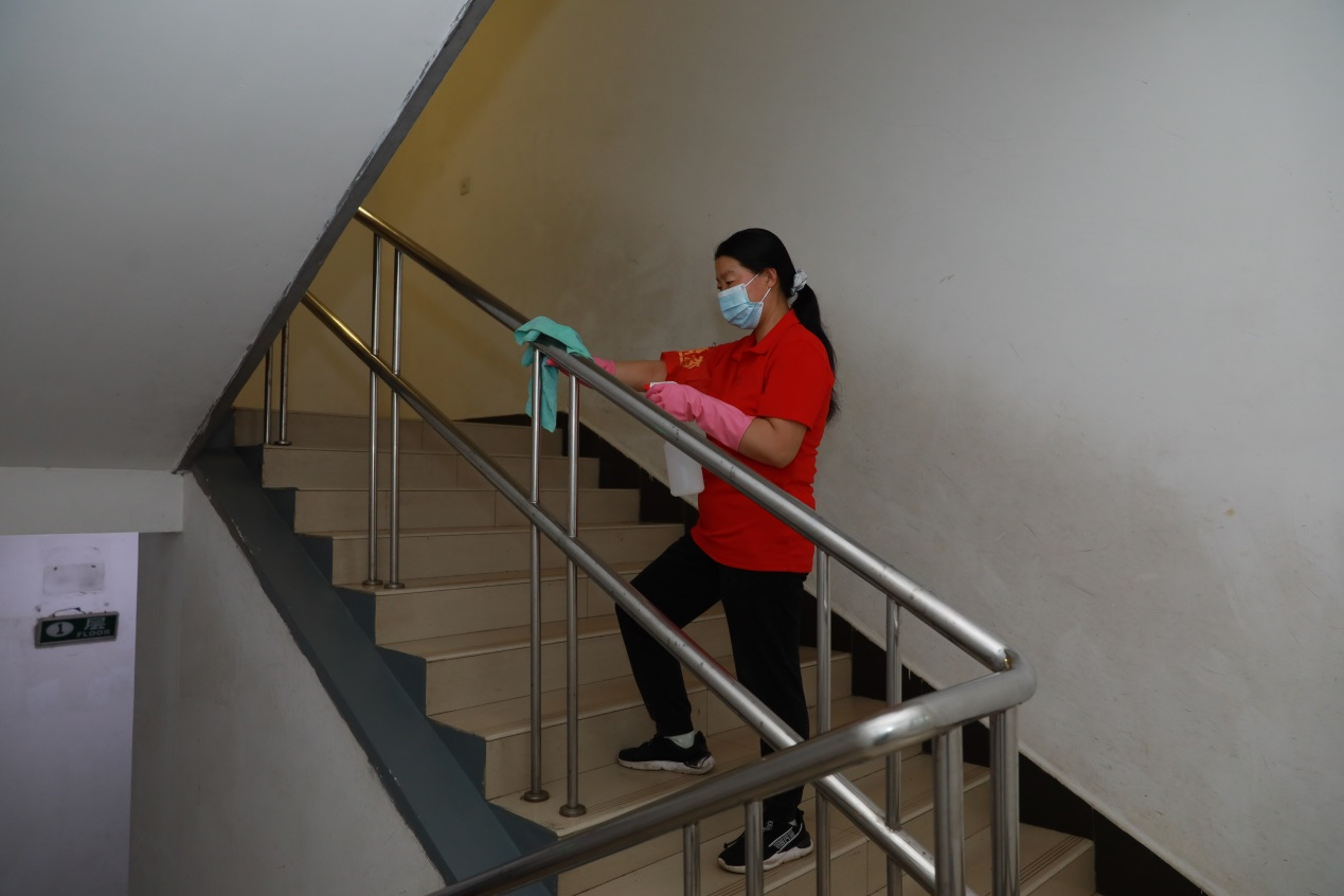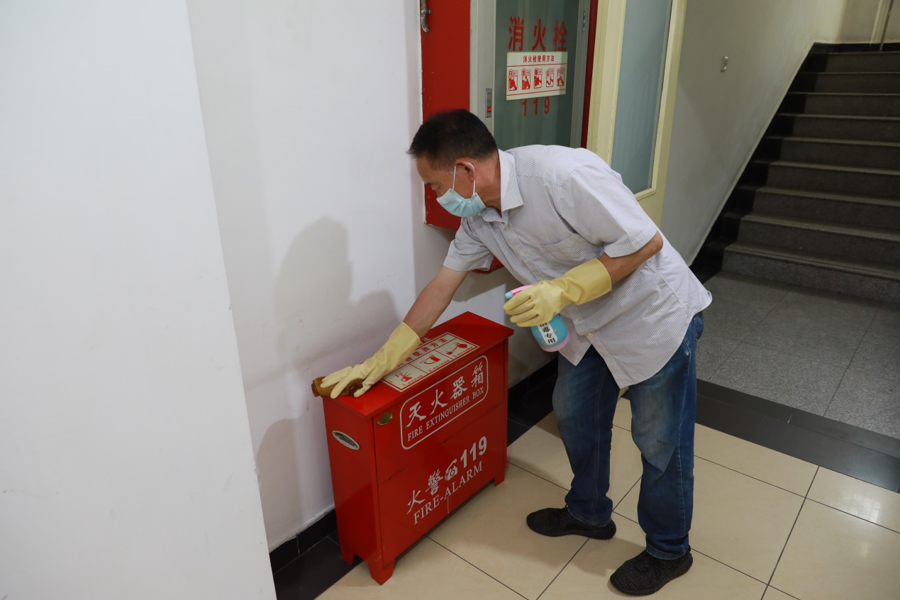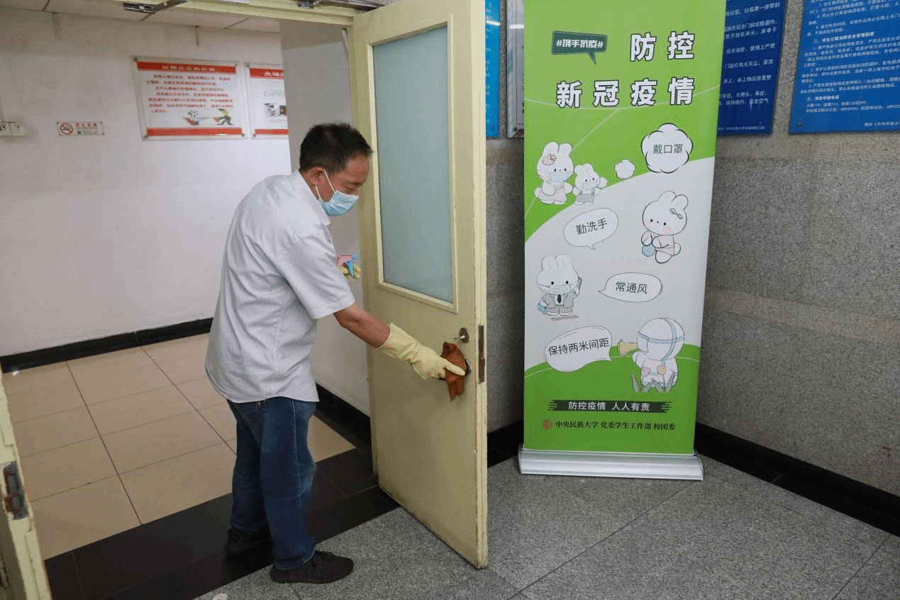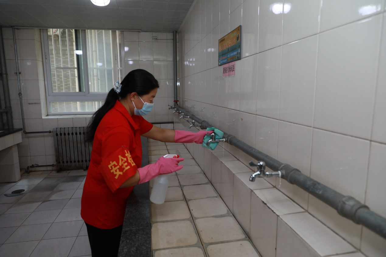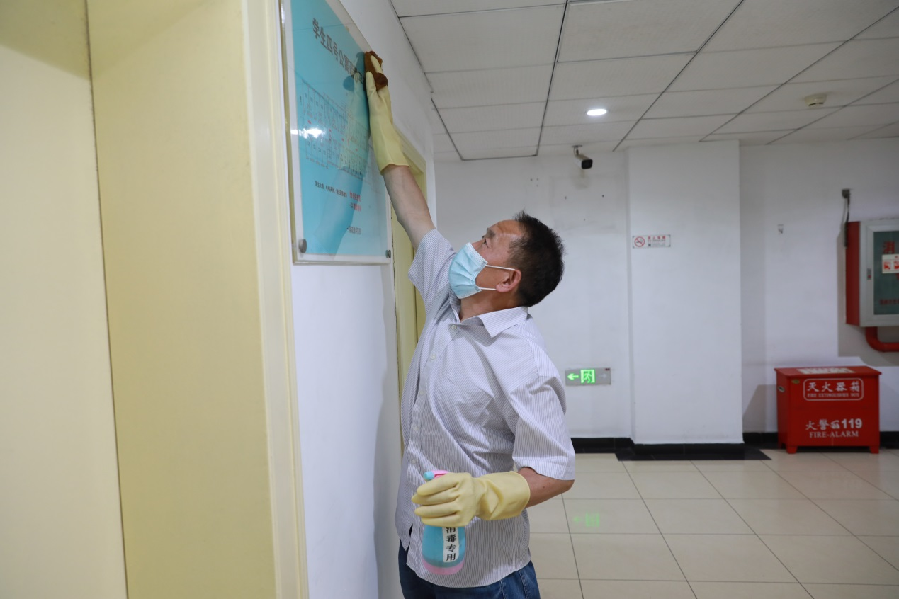 ▲学生4号公寓的保洁员在各个区域进行消杀工作